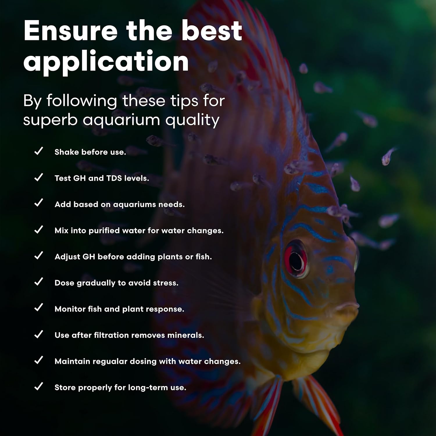 - Establishes an optimal mineral balance in water that has been purified, filtered, (reverse osmosis, deionization, distilled etc.) or is exceedingly soft (well water in forested regions) for all freshwater aquariums
