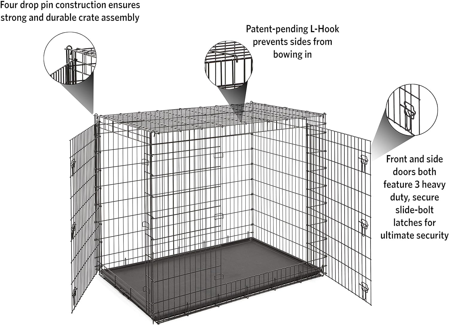 - Dual Door Access: Front and side doors allow flexible crate placement; each door features three heavy-duty slide-bolt latches for added security