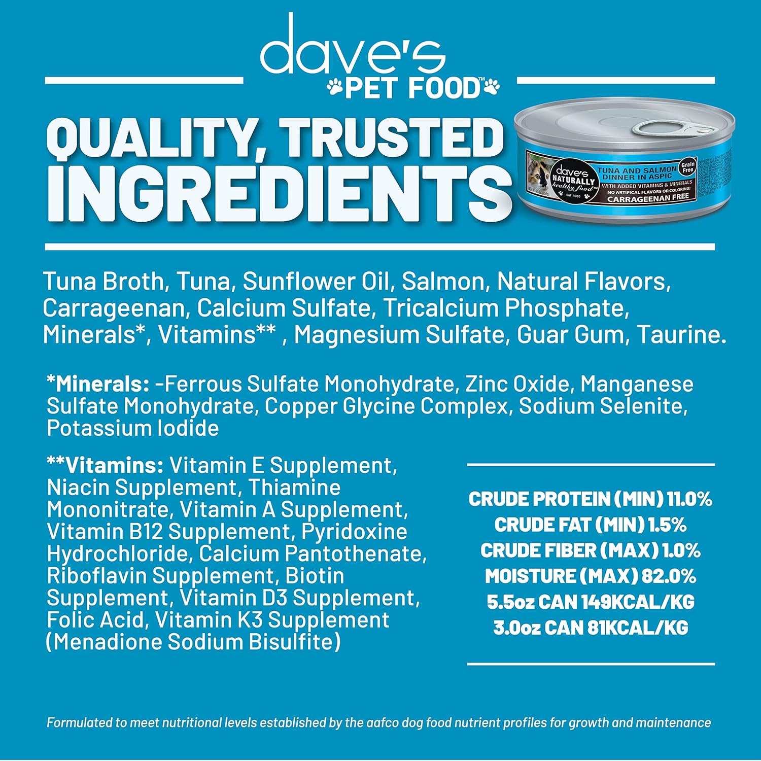 - ADDED VITAMINS & MINERALS. With flavor and nutrition at the forefront, your cat will love the taste of Dave’s nutrient-dense recipe.