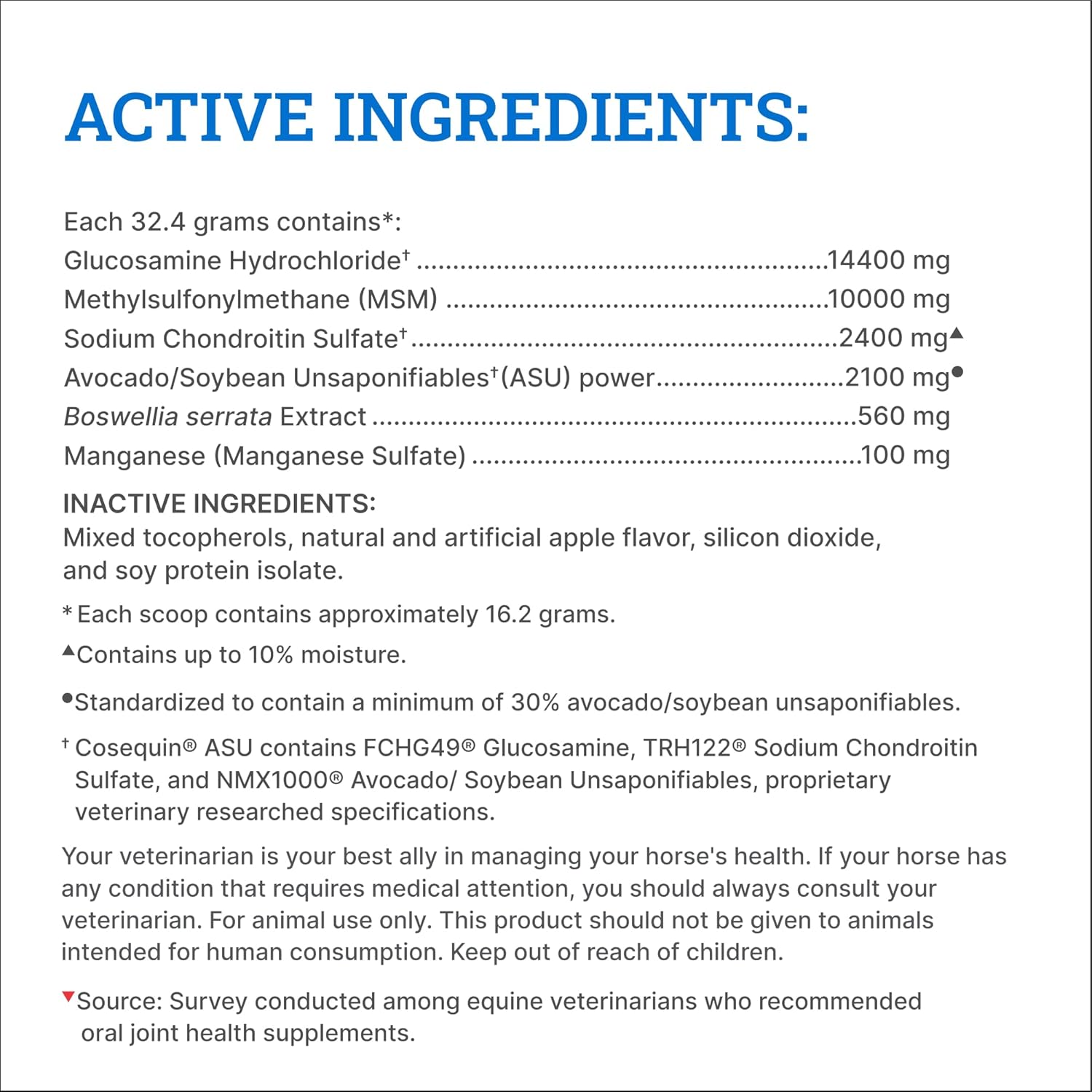 - Joint Health Support for Horses: Cosequin is the #1 veterinarian recommended joint health supplement brand*. This supplement is formulated with glucosamine, chondroitin sulfate, methylsulfonylmethane (MSM), and avocado/soybean unsaponifiables (ASU) to support joint health