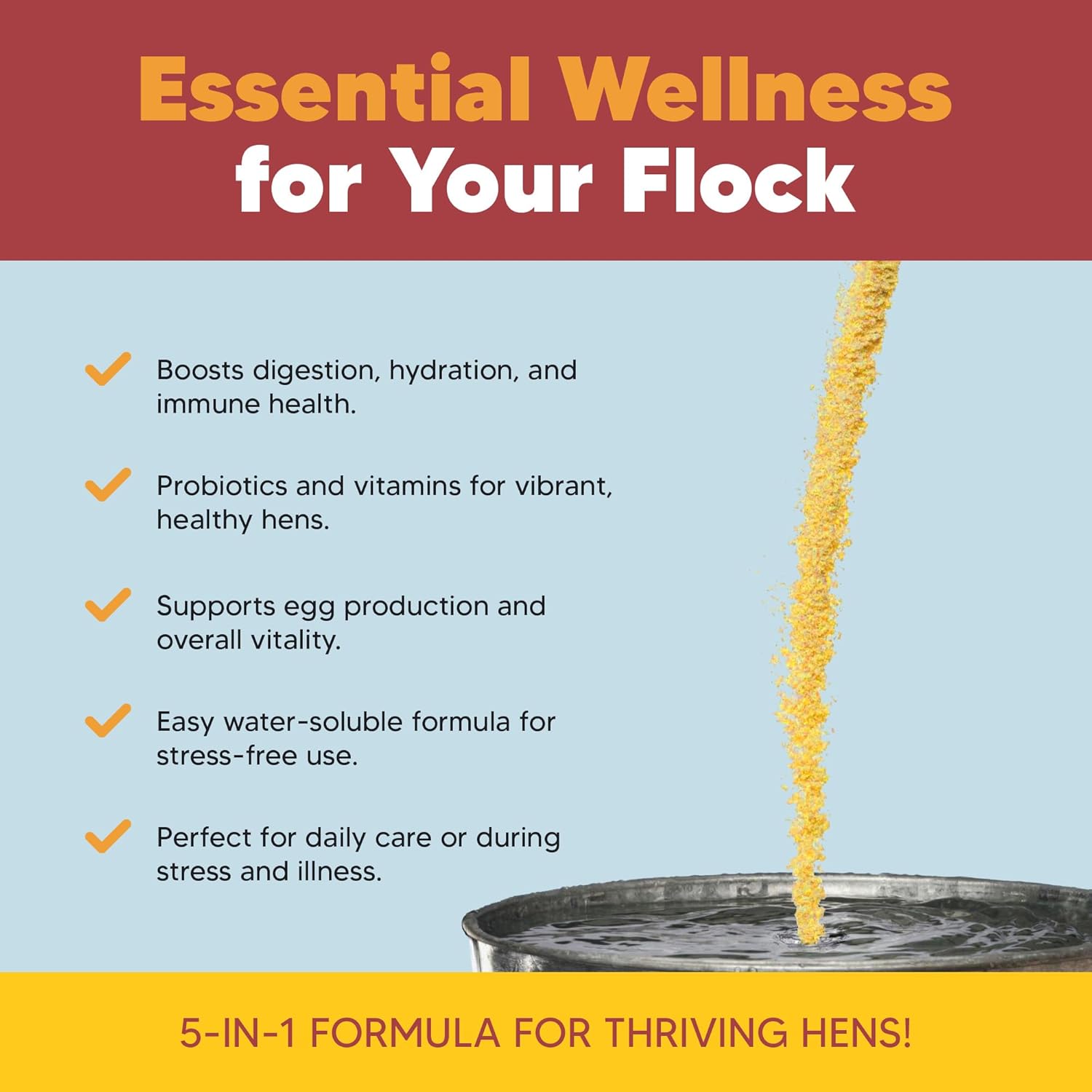 - Chicken Supplements - Packed with the essential nutrients your hens need to thrive, these vitamins for chickens support their overall wellness. With a unique formula that combines the benefits of five products in one bag, it's easy to keep your flock happy.