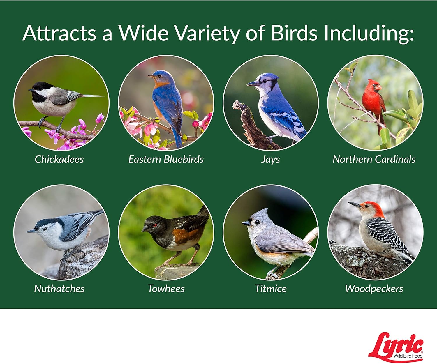 - Attracts wild songbirds like bluebirds, buntings, chickadees, flickers, grosbeaks, house finches, jays, nuthatches, titmice, towhees, woodpeckers, and more