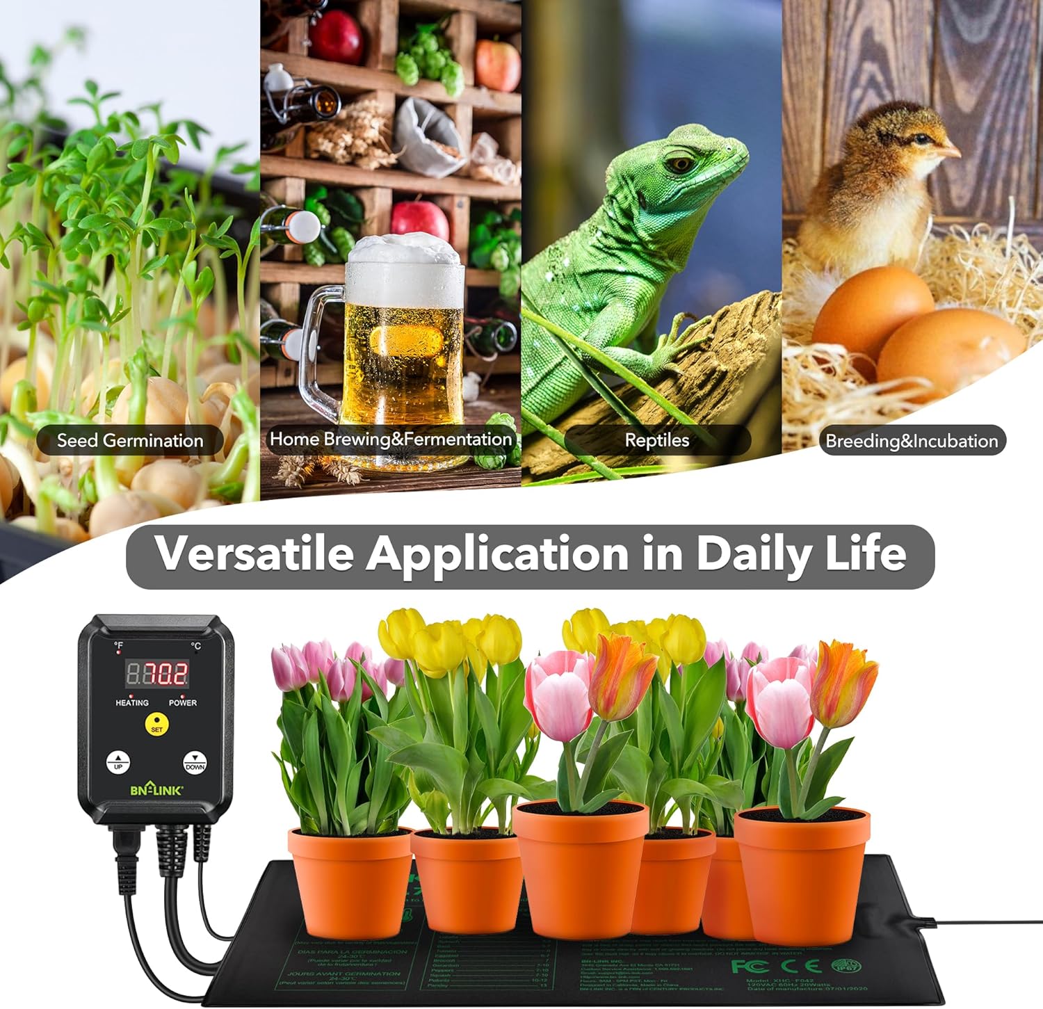 - ✓ VARIETY OF USES: Heat pad thermostat regulates and maintains temperature within a control range from 40–108 ºF. Perfectly compatible with reptile heating pad, seedling heat mat and heat lamp, Widely used in seedling germination, brewing, fermentation, greenhouse, breeding and more.