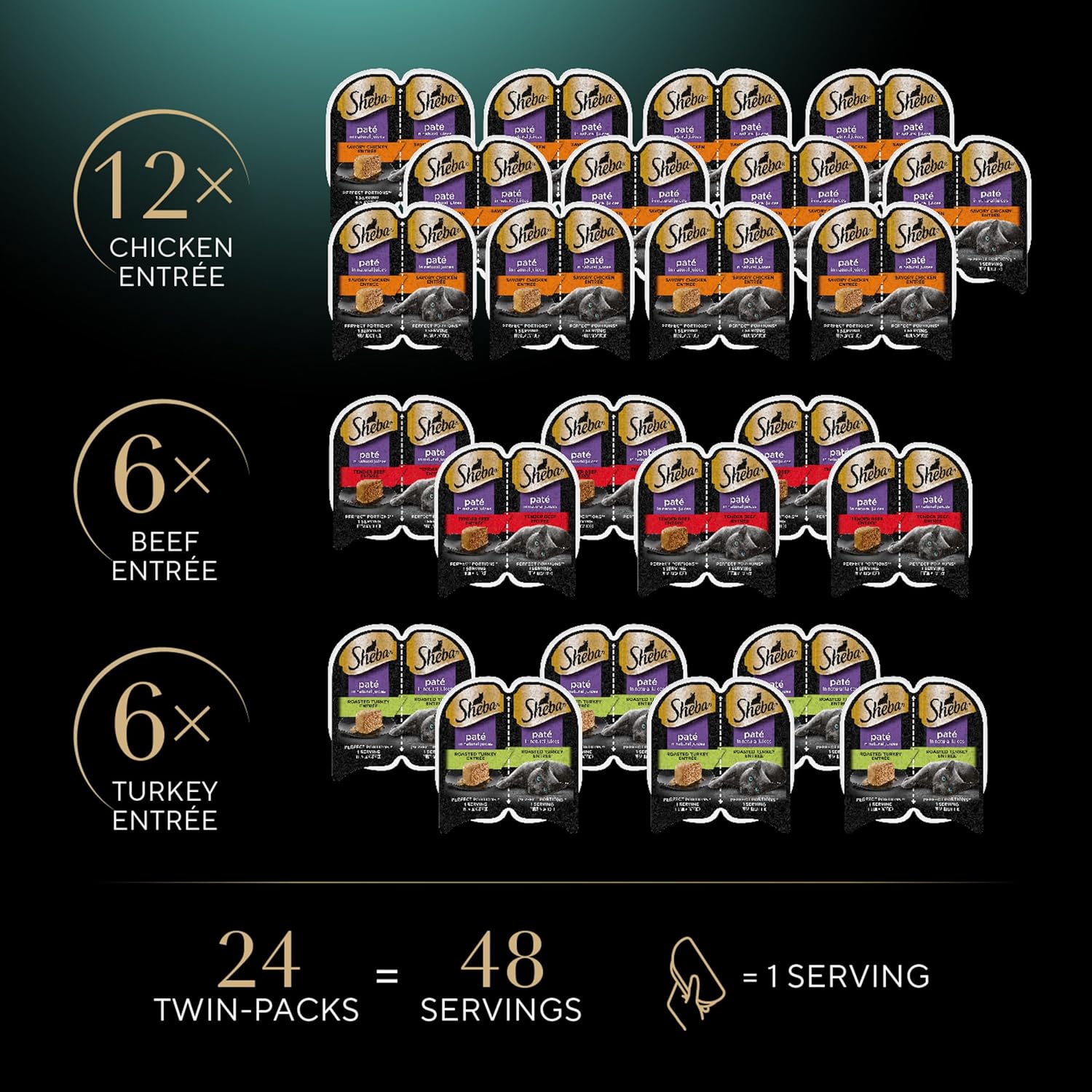 Sheba Perfect Portions Wet Cat Food Pate Savory Chicken Entree, Roasted Turkey Entree, and Tender Beef Entree Variety Pack, 2.6 oz. Twin Pack Trays (24 Count, 48 Servings)