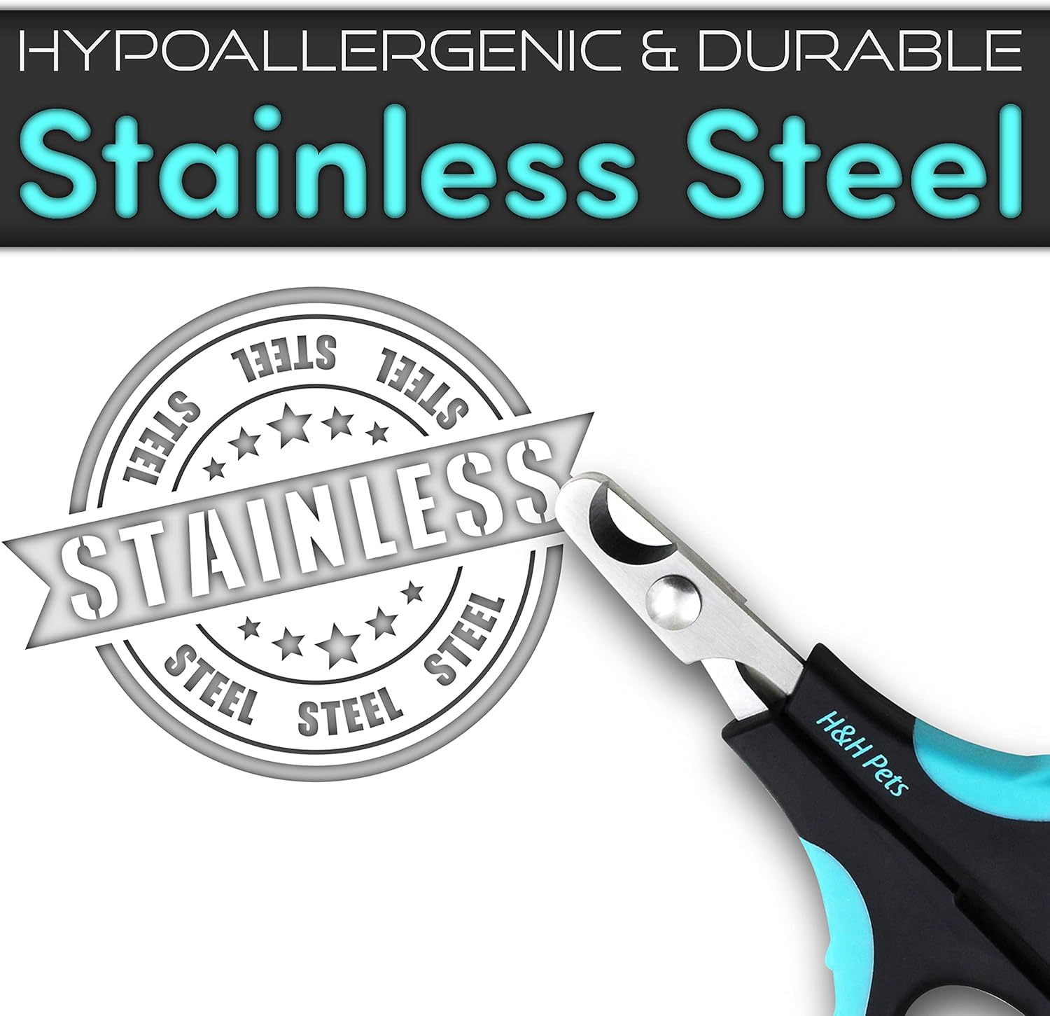 - HIGH QUALITY AND EASY TO USE DESIGN β The cat nail clipper's stainless steel blade is hypoallergenic and durable. The handle is finished with a slip-proof coating that allows you to securely and comfortably grip them in order to prevent painful accidents. Detailed instruction is printed on the back of the package.
