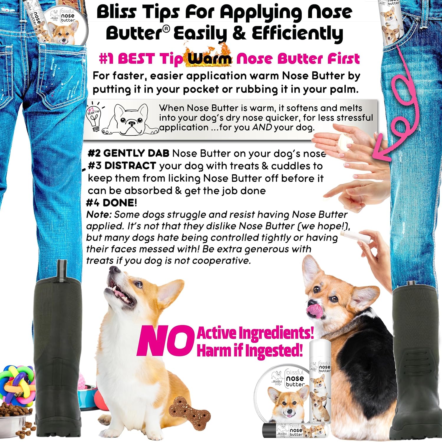 - Easy dog nose care - Easy to apply; Dab onto your dog's nose; that's it! Enriched with shea butter, this dog nose moisturizing butter brings relief to your dogβs dry nose. Non-toxic, no active ingredients, no harm if ingested