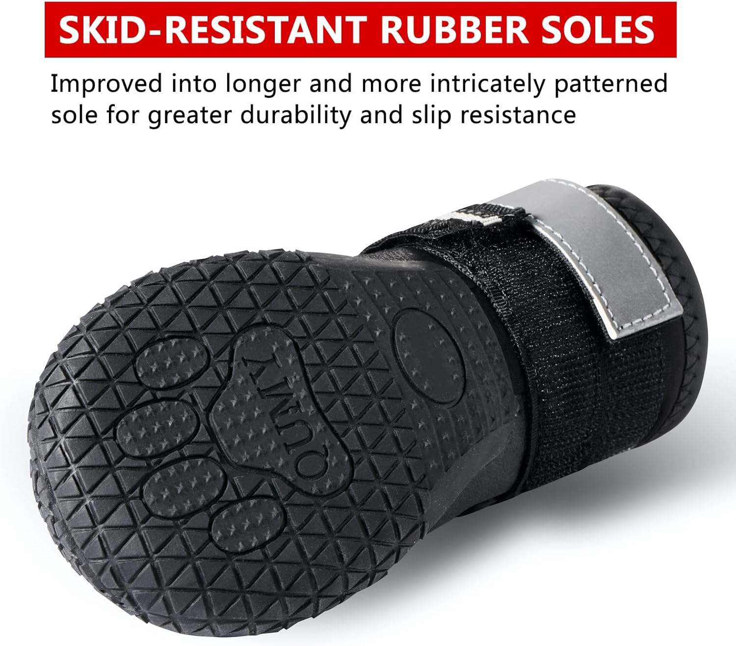 - SECURE and ADJUSTABLE: Easy to put on / off. These dog shoes expands with a wide split seam opening and two adjustable and reflective straps to ensure a tight fit, also make your dog safe at night