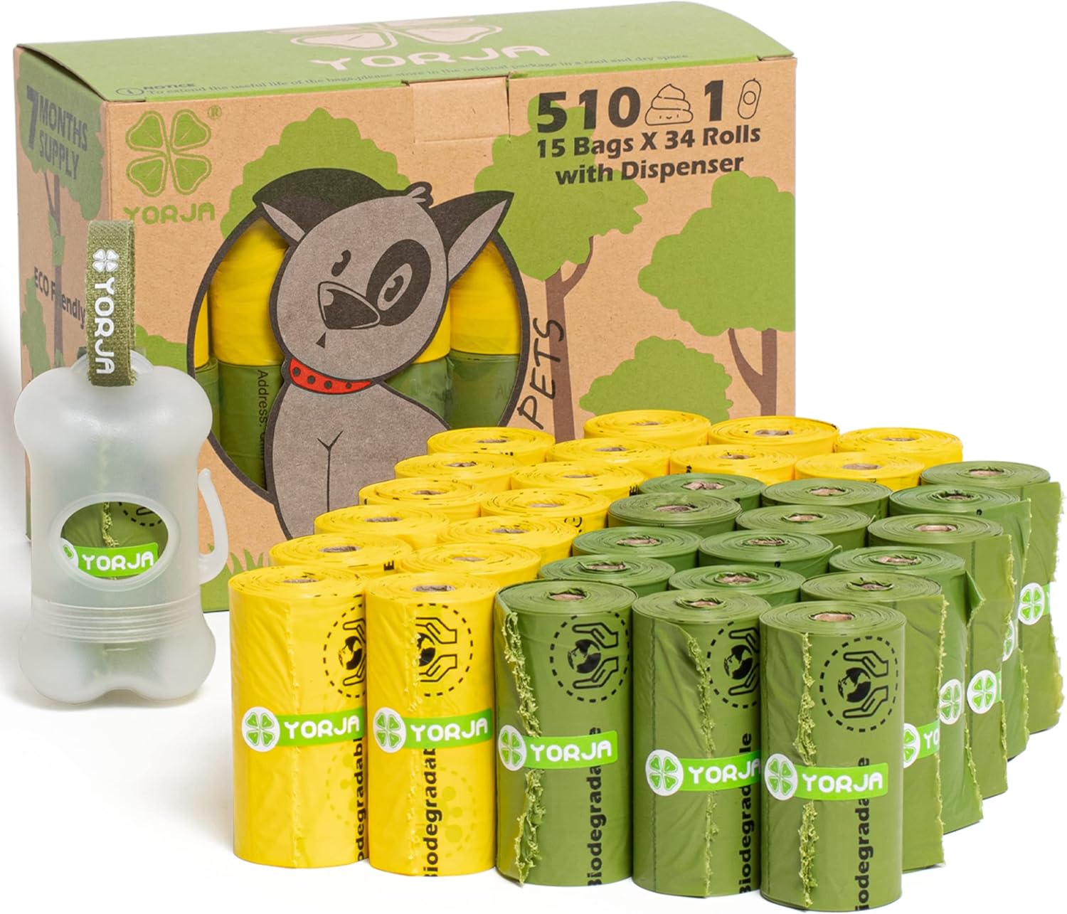 YORJA Dog Poop Bags Rolls with Dispenser & Holder, 510 Pet Waste Bags, 100% Leak Proof Extra Thick and Strong Corn Starch Blend