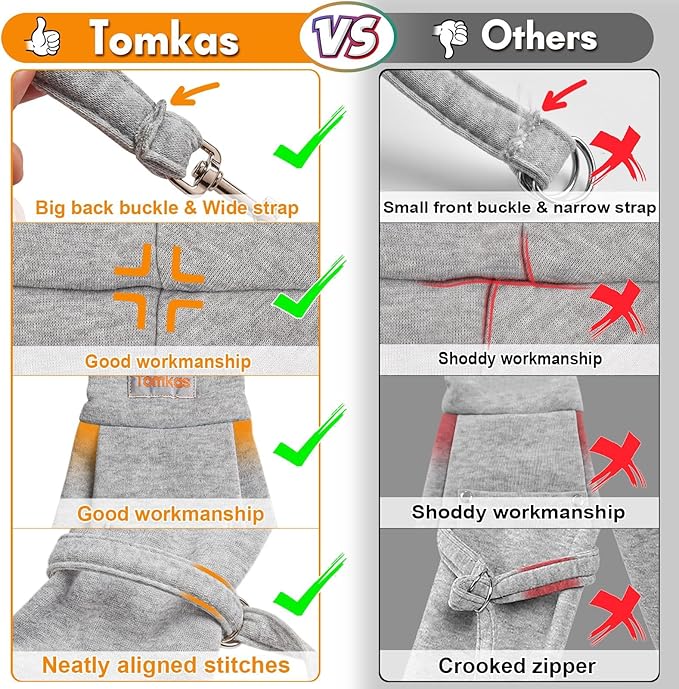 - Sufficient Safety: pets can be easily put into TOMKAS small dog carrier sling after a brief acclimation. You just put your dog in it, attach the safety buckle to the leash buckle on the vest or harness. If your pet wants to jump out of the pouch, the safety belt will stop it from this dangerous behavior and keep your puppy safe. TOMKAS small dog sling is very reliable in terms of safety.Remember, never tie the safety buckle to the collar, it could hurt the dog's neck if it jumps out.