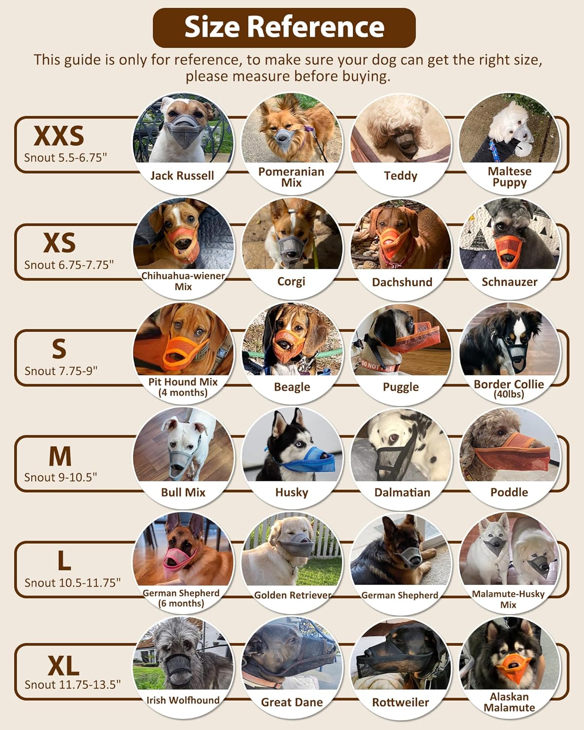 - Dog Muzzle Medium Sized Dogs: The selected size is M, with snout circumference of 9'' to 10.5''. Suitable for Husky, Border Collie, etc. Every dog’s snout is unique, please Measure Before Purchasing. Don't select a size based on breed or previous orders. If your dog's measurements are between two sizes, please choose the smaller size. (Note: Not for fierce dogs, overactive dogs, or short-snout dogs.)