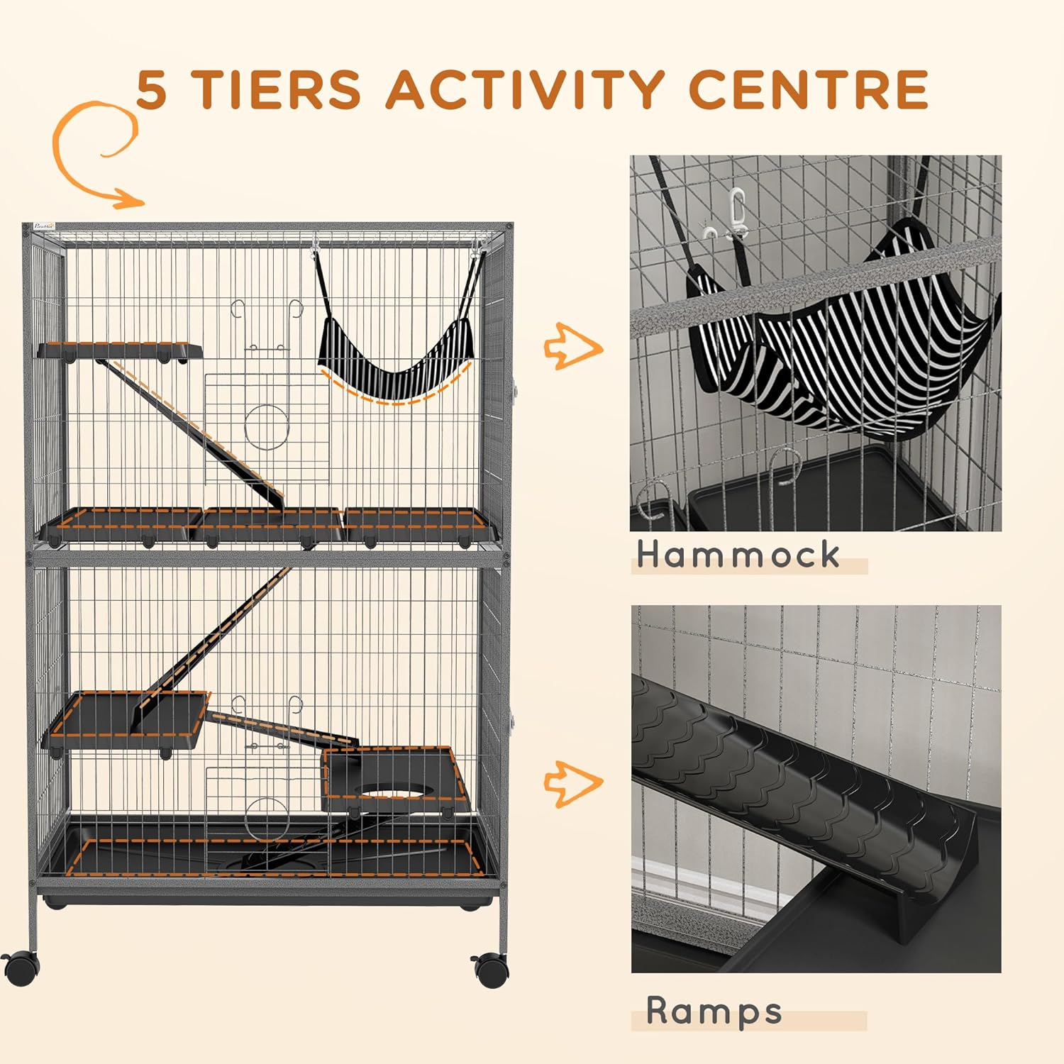 - Spacious Size: The large design of this pet cage offers your pet a lot of height to climb for fun and exercise. A hanging hammock is included for a comfortable nap spot at the top. The five-tier layout allows a big, cozy living space.