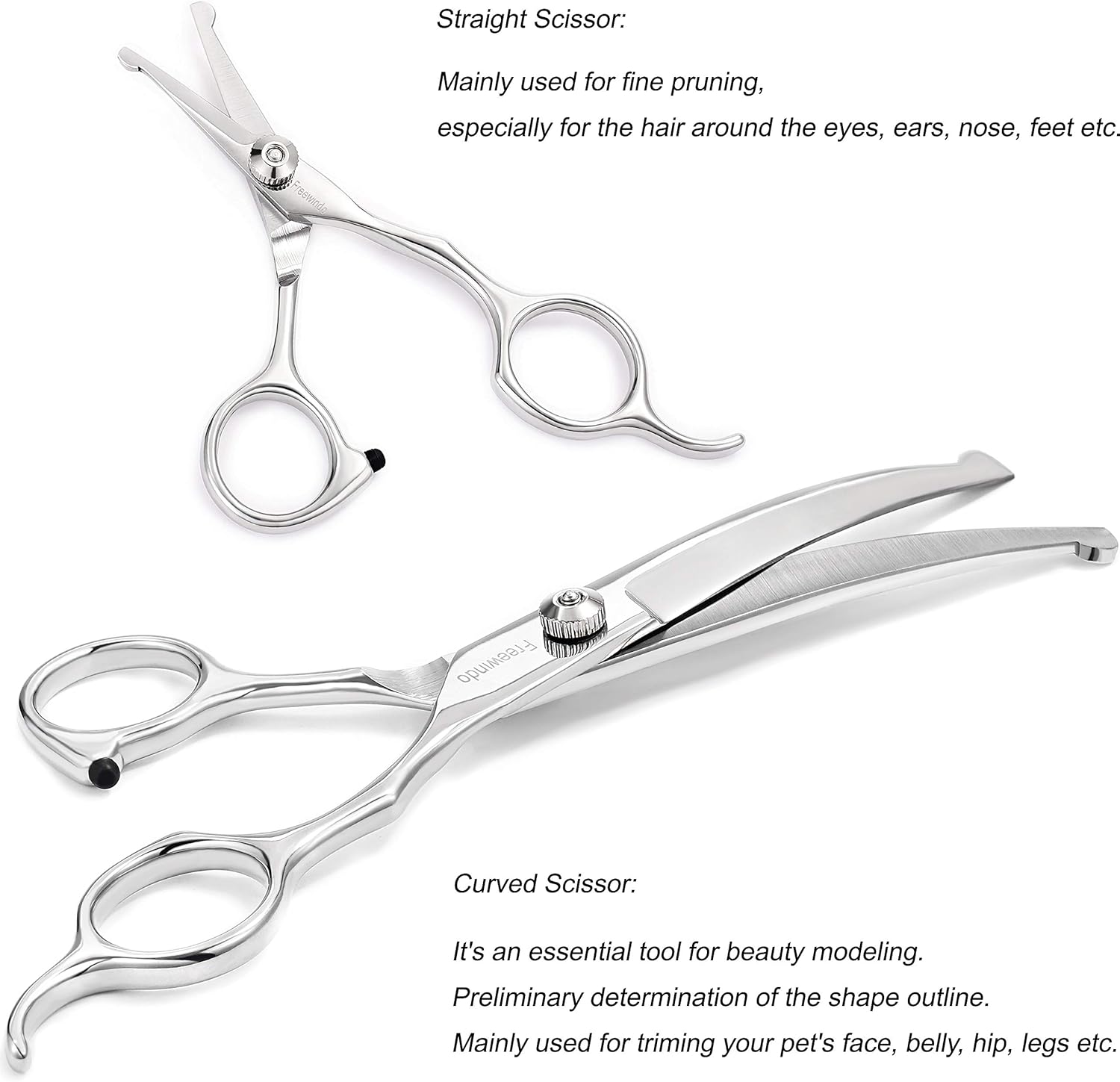- ELABORATE DESIGN: Rubber pad at the handle of the dog hair scissors is a muffler pad which makes your pet will not be as scared as electric clippers. The semicircle design blades of nail clippers match with the shape of the pet's nails, clearly showing where you are cutting, making it easy and safe to trim. Whether grooming shears or nail clippers are designed ergonomically for maximum comfort which will reduce hand fatigue for long time use.