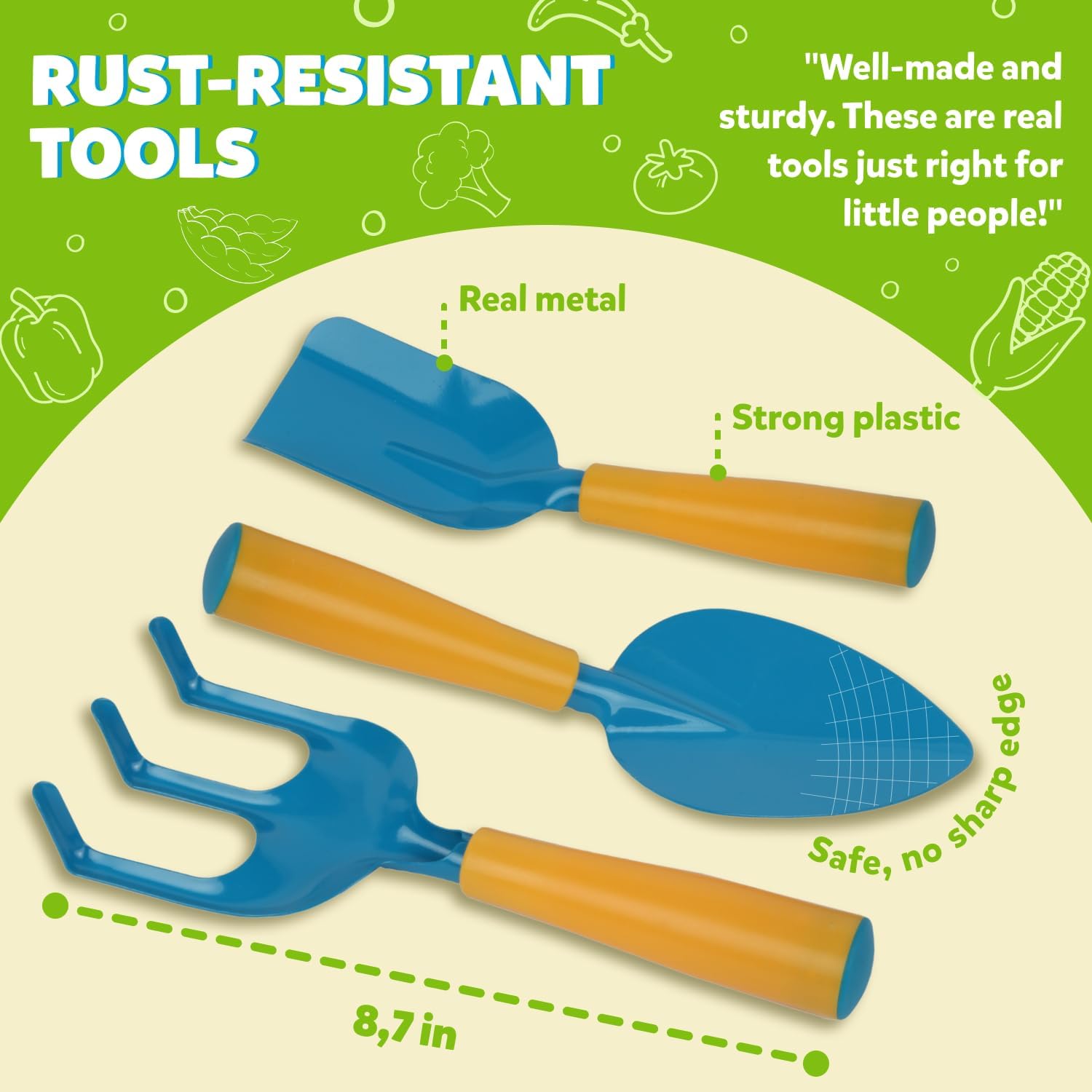 - REAL TOOLS, PERFECT FOR LITTLE HANDS – Unlike flimsy plastic sets, these real metal tools are just the right size for kids! “My 5 and 3-year-old love digging in the dirt just like grown-ups!”