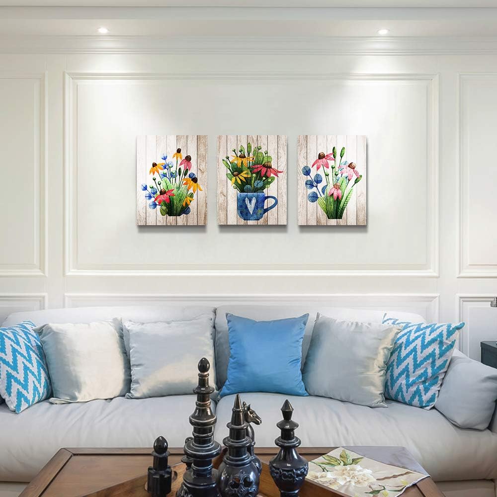 Vintage Wood grain plant flowers wall art for kitchen Wall Decorations for Living Room Bathroom Decorations room Wall decor 3 Pieces Framed Canvas print Artwork modern Office Home Decor paintinge