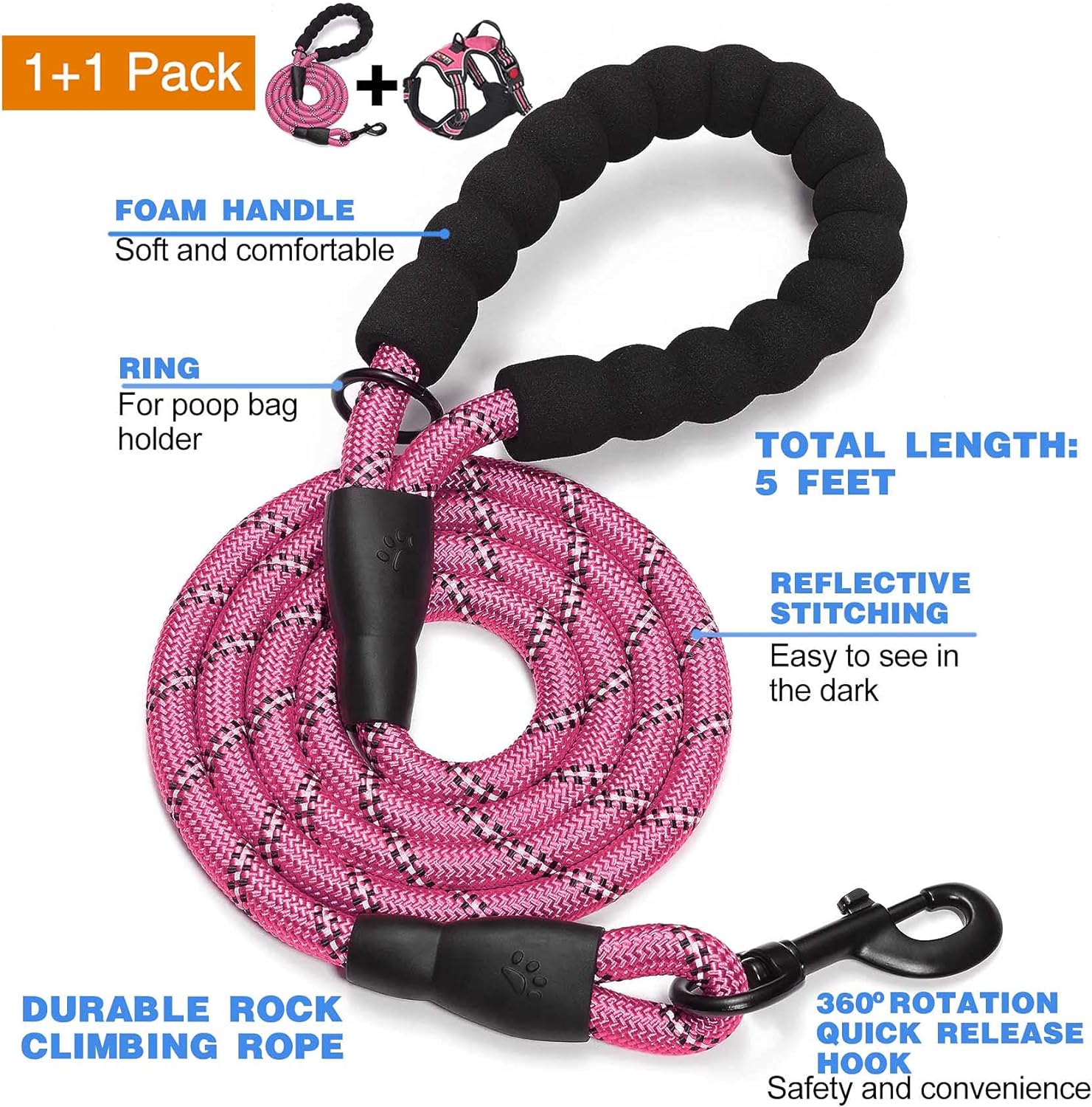 No Pull Dog Harness Adjustable Reflective Oxford Easy Control Medium Large Dog Harness with A Free Heavy Duty 5ft Dog Leash (XL (Neck: 21.5"-33", Chest: 30"-39.5"), Pink Harness+Leash)