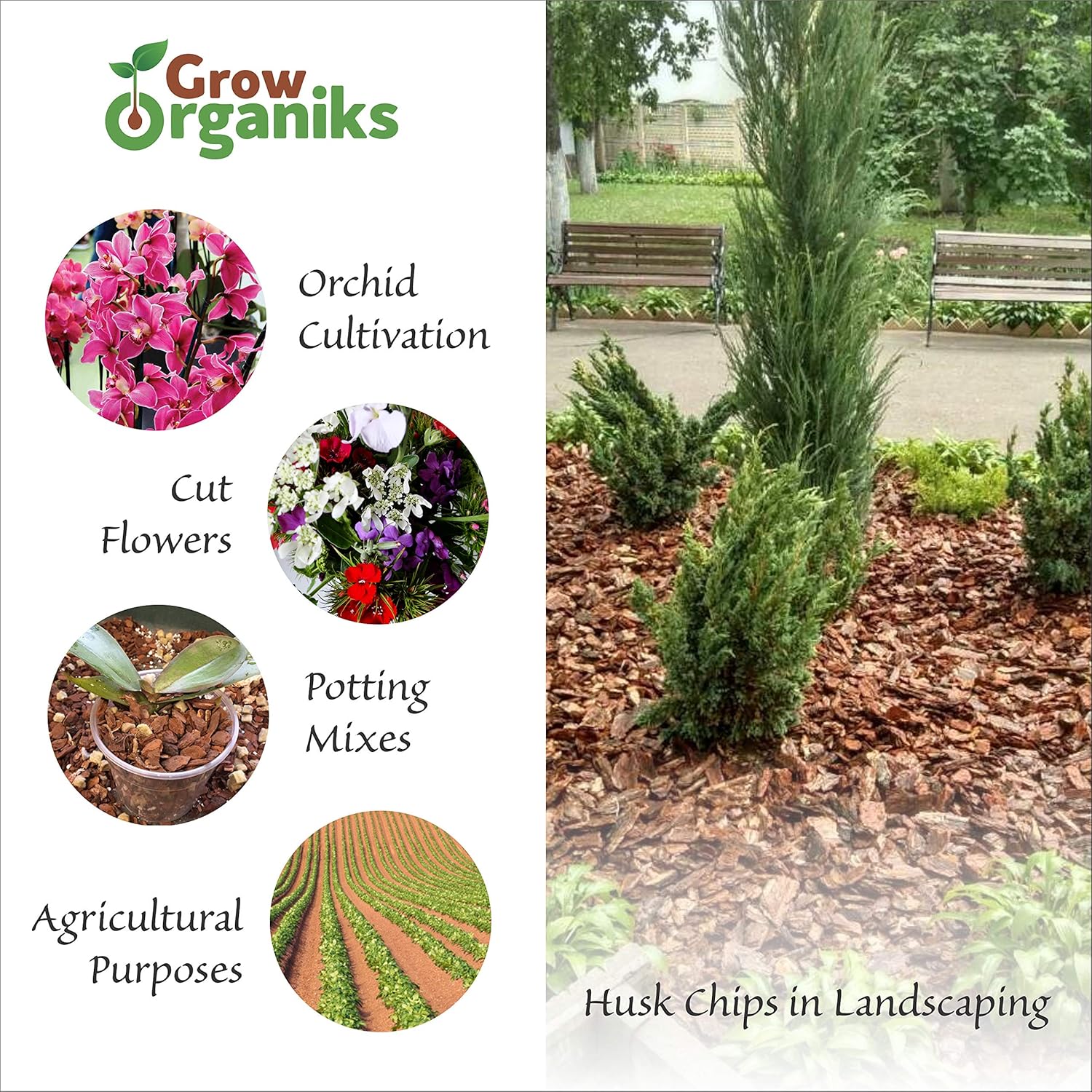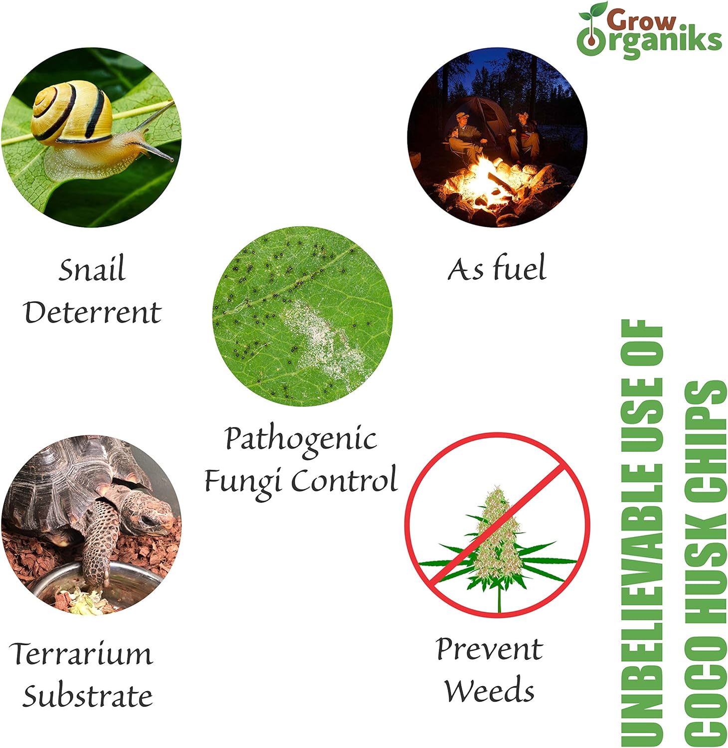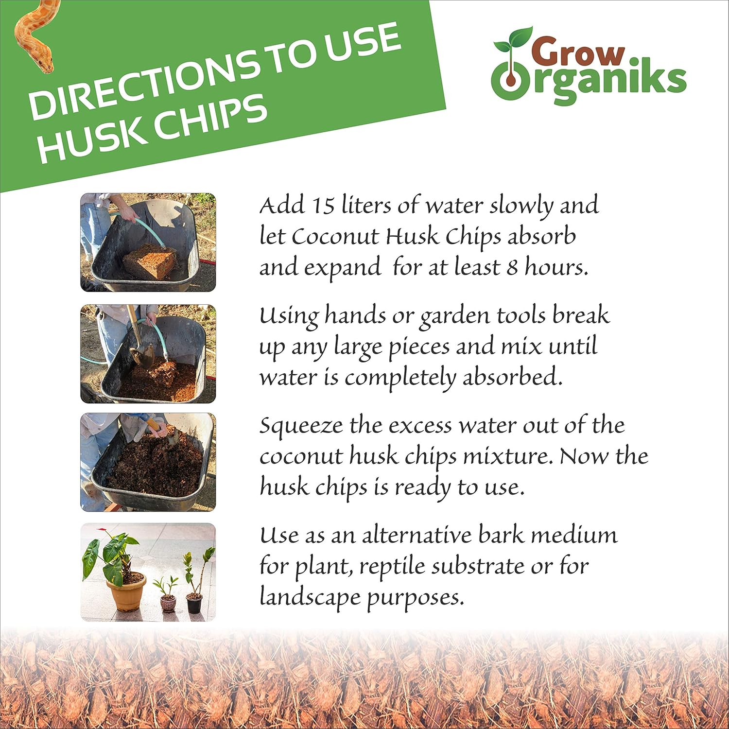 - [π100% Natural & Biodegradable] Grow Organiks Coconut Husk chips are cut pieces of the husk of the coconut compressed into 11 lbs.Coconut husks are a sustainable alternative to other mulches. Our Organic coco chips are best suitable for growing plants, and also perfect for reptile substrate.