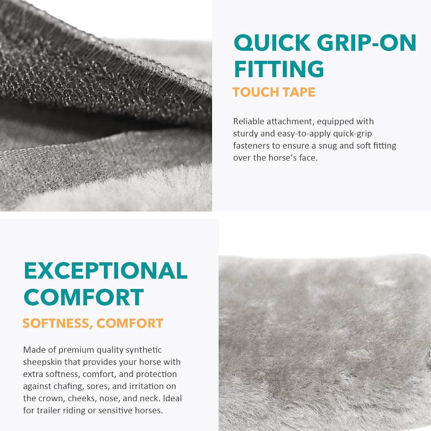 - QUICK GRIP-ON FITTING: Reliable attachment, equipped with sturdy and easy-to-apply quick-grip fasteners to ensure a snug and soft fitting over the horseβs face.
