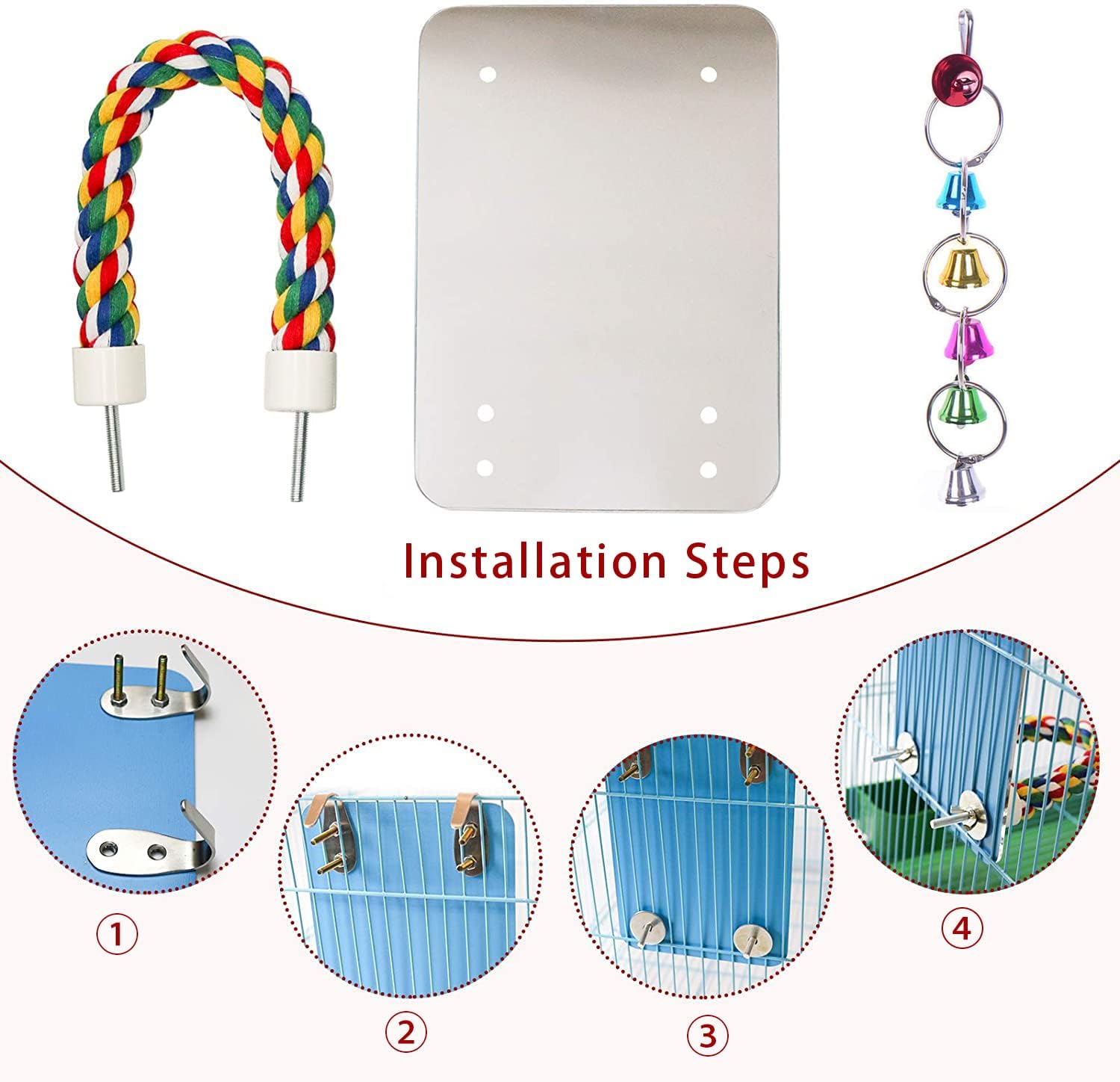 - 【Colorful rope perch】Comfortable for bird standing & safe for bird chewing. It will soothe and exercise tender feet for your lovely birds. you can hang the mirror anywhere in the cage.