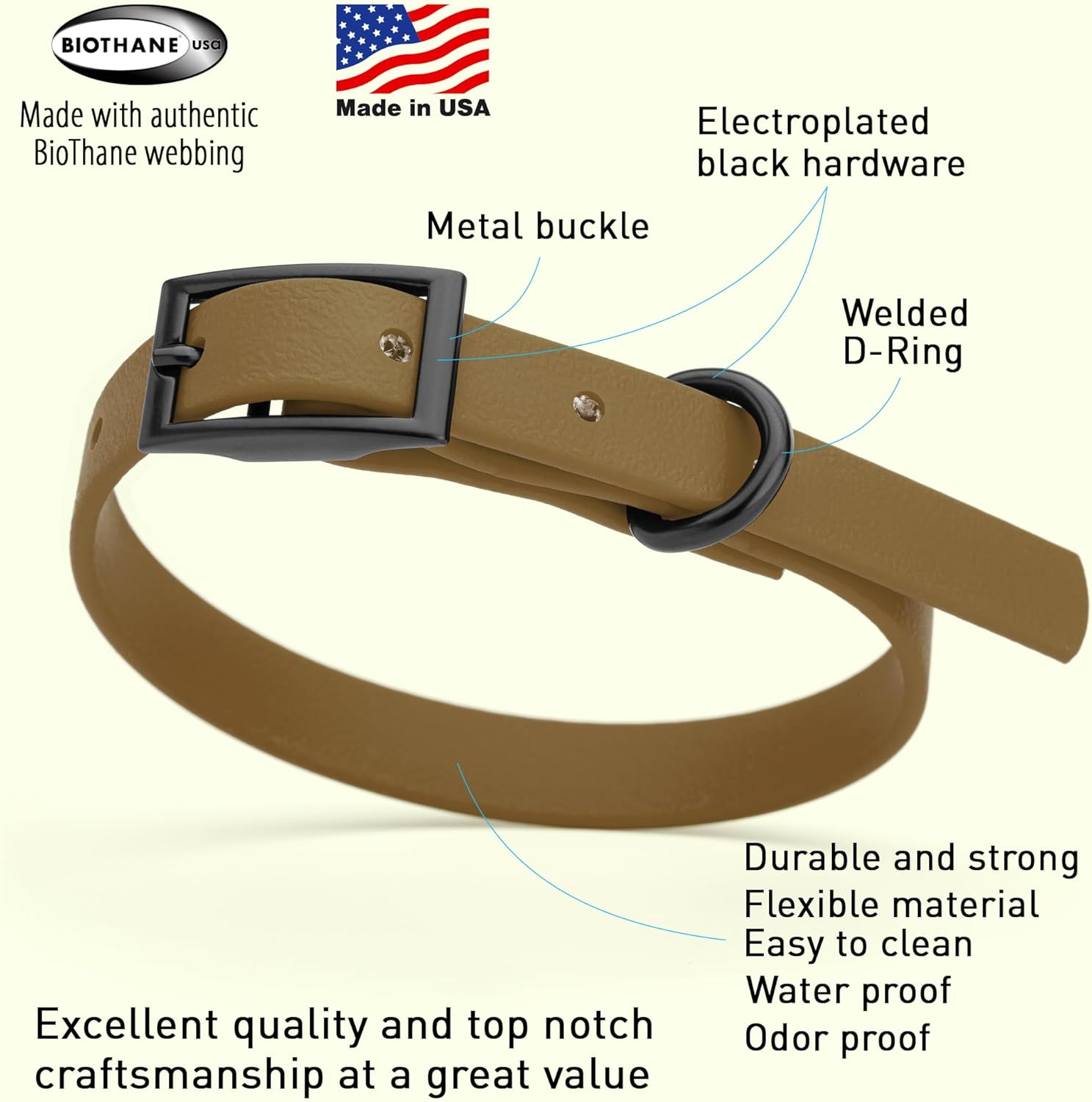 Dogline Biothane Waterproof Dog Collar Strong Coated Nylon Webbing with Black Hardware Odor- Proof for Easy Care Easy to Clean High Performance Fits Small Medium or Large Dogs, Coyote Brown