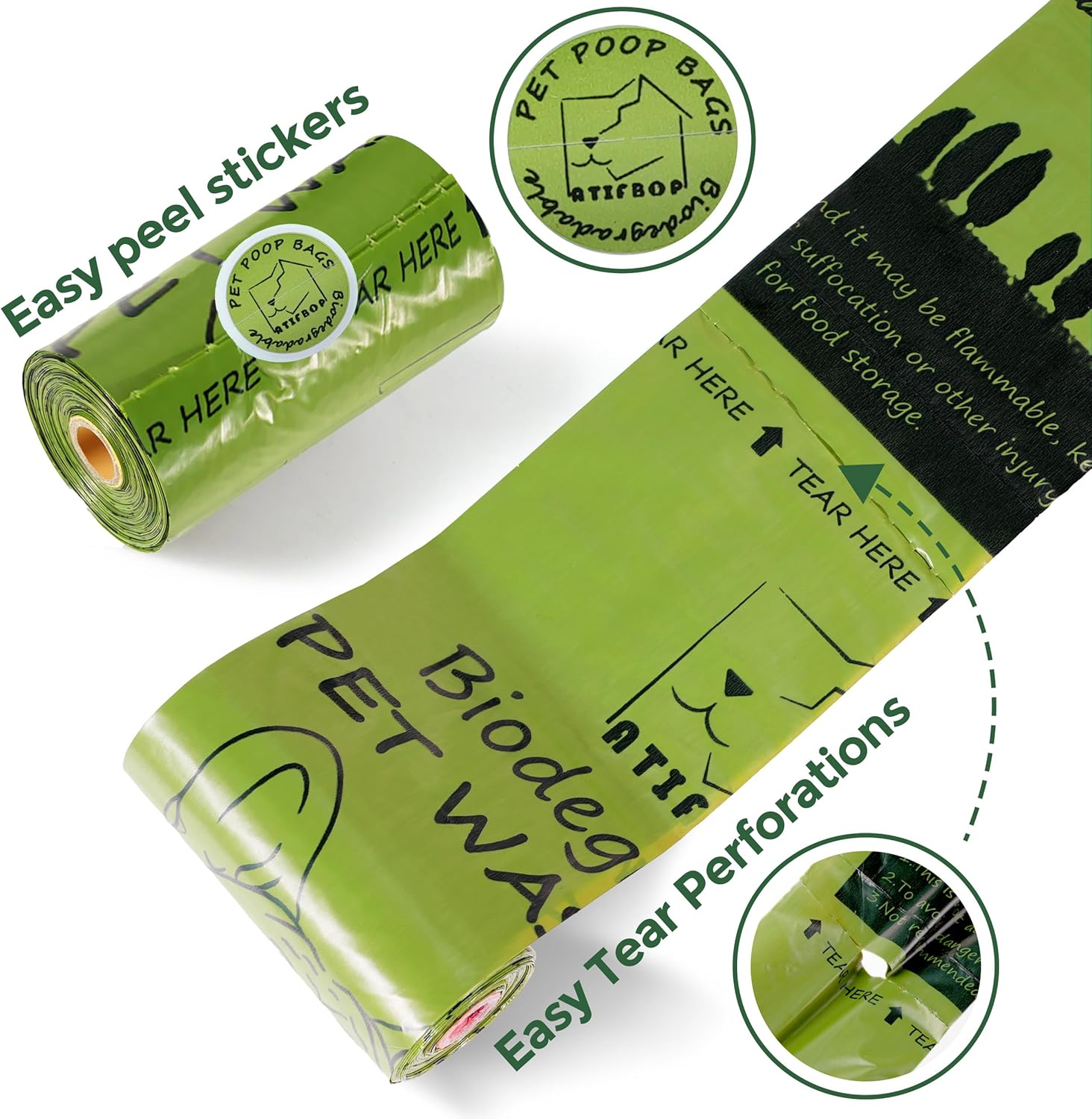 - BIODEGRADABLE POOP BAGS: Take your part in saving the planet by using ATIFBOP dog poop bag! Our poop bags are BPA free. Packaging and roll cores are recyclable. The dog poop bag rolls will naturally break down to protect the planet where your fur friends lives.