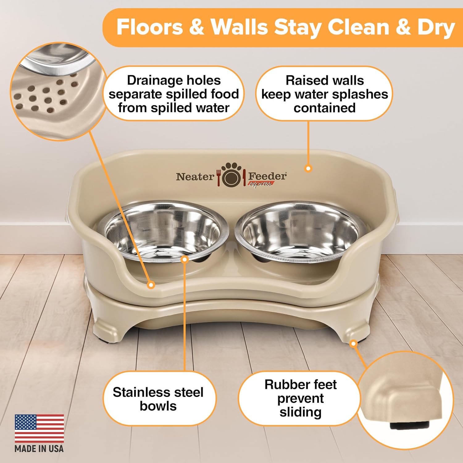 Neater Feeder Express Mess Proof Dog Bowls Elevated for Small Breeds Under 15 Lb, Made in USA, No Spill Raised Dog Food Bowl Stand, Stainless Steel Food and Water Bowl Set, Feeding Station, Almond