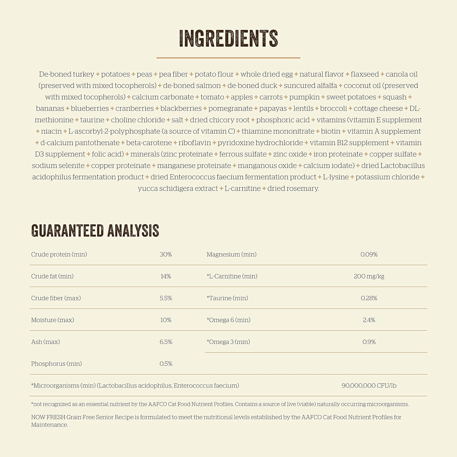 Now Fresh Grain-Free, Dry Cat Food, Turkey, Salmon and Duck Kibble, Real Meat and Fish Senior Recipe, 3 lb Bag