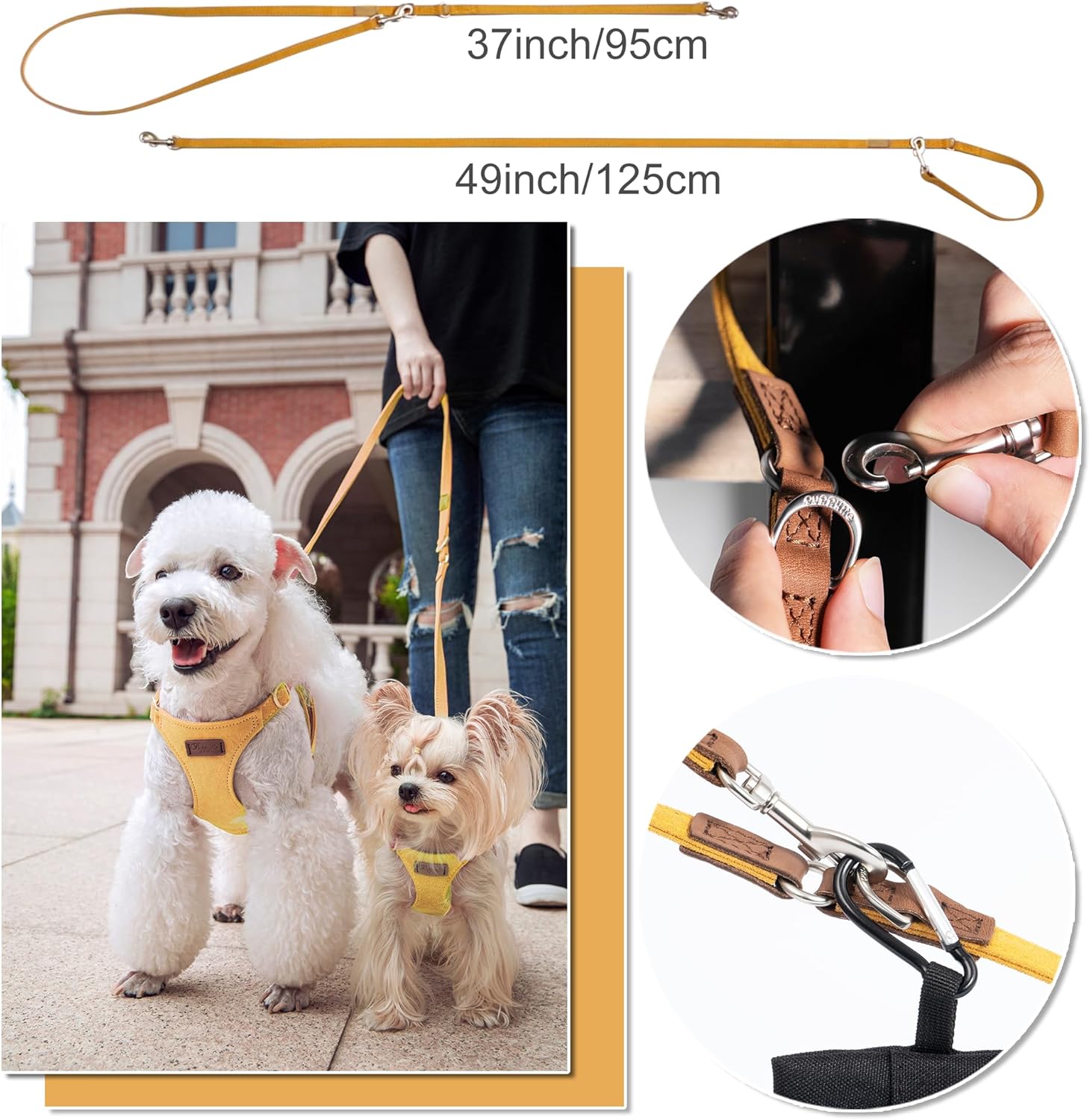 - Dog leash:Puppytie’s dog harness is equipped with a multi-functional leash, which can be adjusted in two lengths of 49inch and 37inch. You can use it to easily carry two dogs out. It has the function of carrying keys or garbage bags. The function of wait in place allows dogs to wait in place quickly and safely