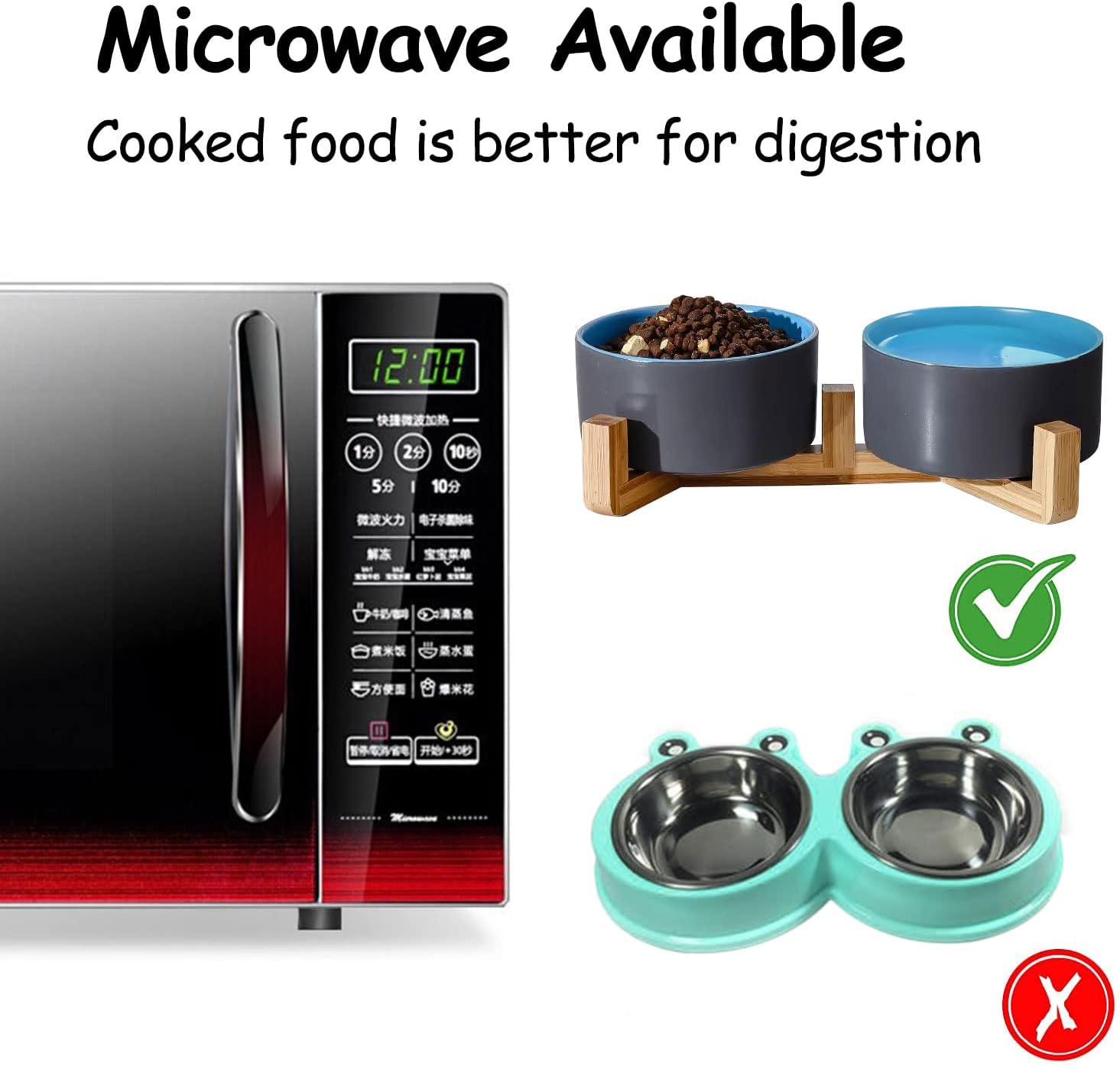 - Double Bowl Design - One bowl for food and one for water for dogs or cats , Each cat dog ceramic bowl has a Unique bamboo stand, raising the dishes closer to your pet for more comfortable eating.