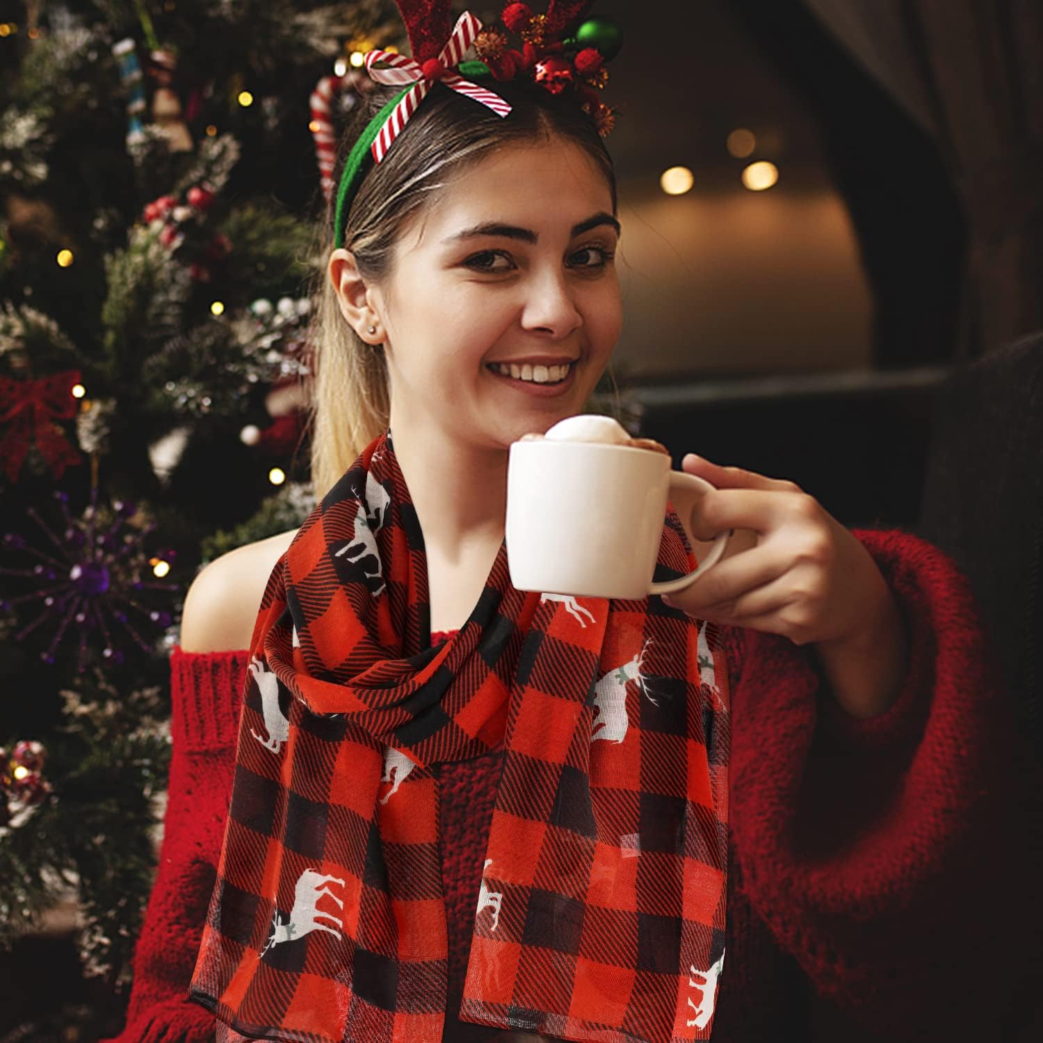 - Unique style: Christmas scarfs for women dressy with classic red and black plaid, vintage and fashionable. The design of cute elks pattern make christmas themed scarfs simple and versatile, and add appeal and glamour for your wear.