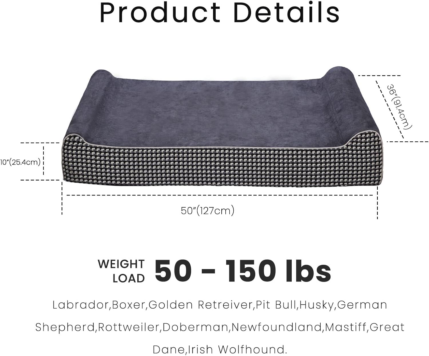 - King Size 50"L x 36"W x 10"H Dimensions for dogs 50-150 lbs and under. The Laifug foam bed will become your pet's favorite sleeping spot