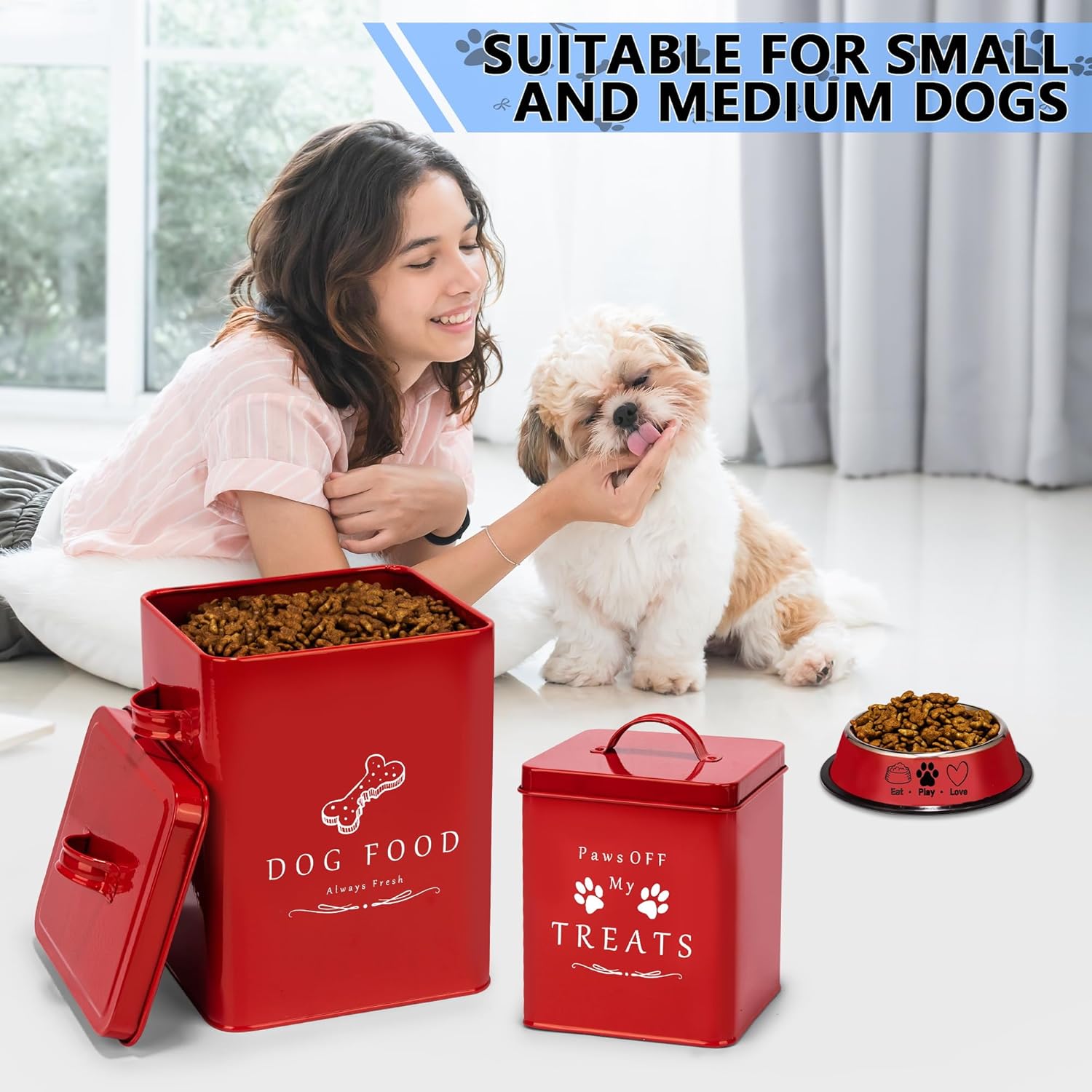 - UNIQUE SET of 4 ITEMS! Inside the package, you will find: a Large Metal Dog FOOD BIN with Lateral Handles and Lid (10.2''x7.1''x6.3'', fits in 5-7 Lbs of dry food, depending on the size of the food grains) || a Metal TREATS CONTAINER with Lid (7.5''x5.5''x5.5'', fits in up to 2.25 Lbs of dry food, depending on the size of the food grains) || a FOOD SCOOP || a Glossy Red Pet FOOD BOWL for dry or wet food (4.5" diameter)