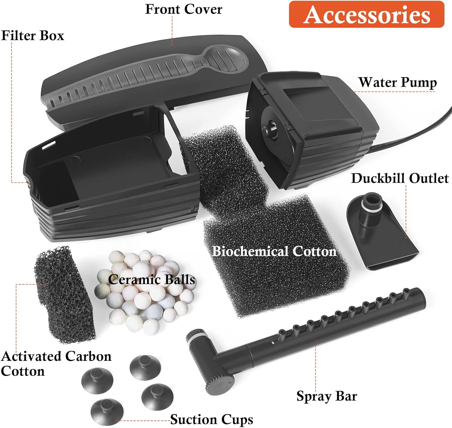 - 【Ultra Quiet Filter】For this new aquarium filter, we have improved the internal structure of the water pump to further enhance the sound insulation effect. Once the filter is placed in the water and the filter is turned on, you can hardly hear the sound of the motor, only the sound of the water spraying out. Noise Level<35dB.