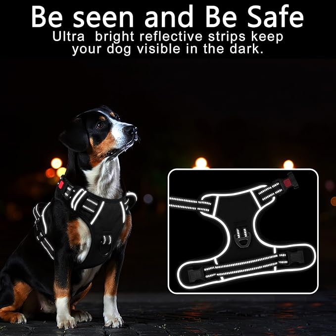 - 【MUCH SAFER & MORE COMFORTABLE】 Breathable mesh lining with soft sponge padding plate of puppy harness prevents injuries, giving extra comfort and protection with enhanced 1600D oxford fabric. The reflective material will be really nice when it gets dark. Also, your dog will be saw easily. This reflective material can make drivers have long time to react, which ensure your dog’s safety!
