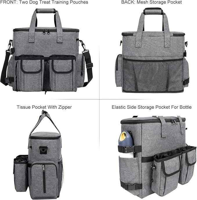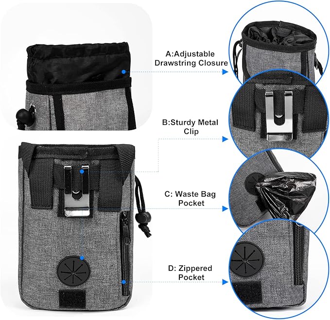 - Dog Travel Accessories: two detachable pet training bags make the pet organizer more functional.The on-the-go dog treat pouch can carry your dog's favorite treat and toys.With big opening and drawstring closure allows quick access to pouch with one hand.You can also securely store your personal belongings, such as phone, keys, or wallet in the pouch.Perfect choice for dog training at the park