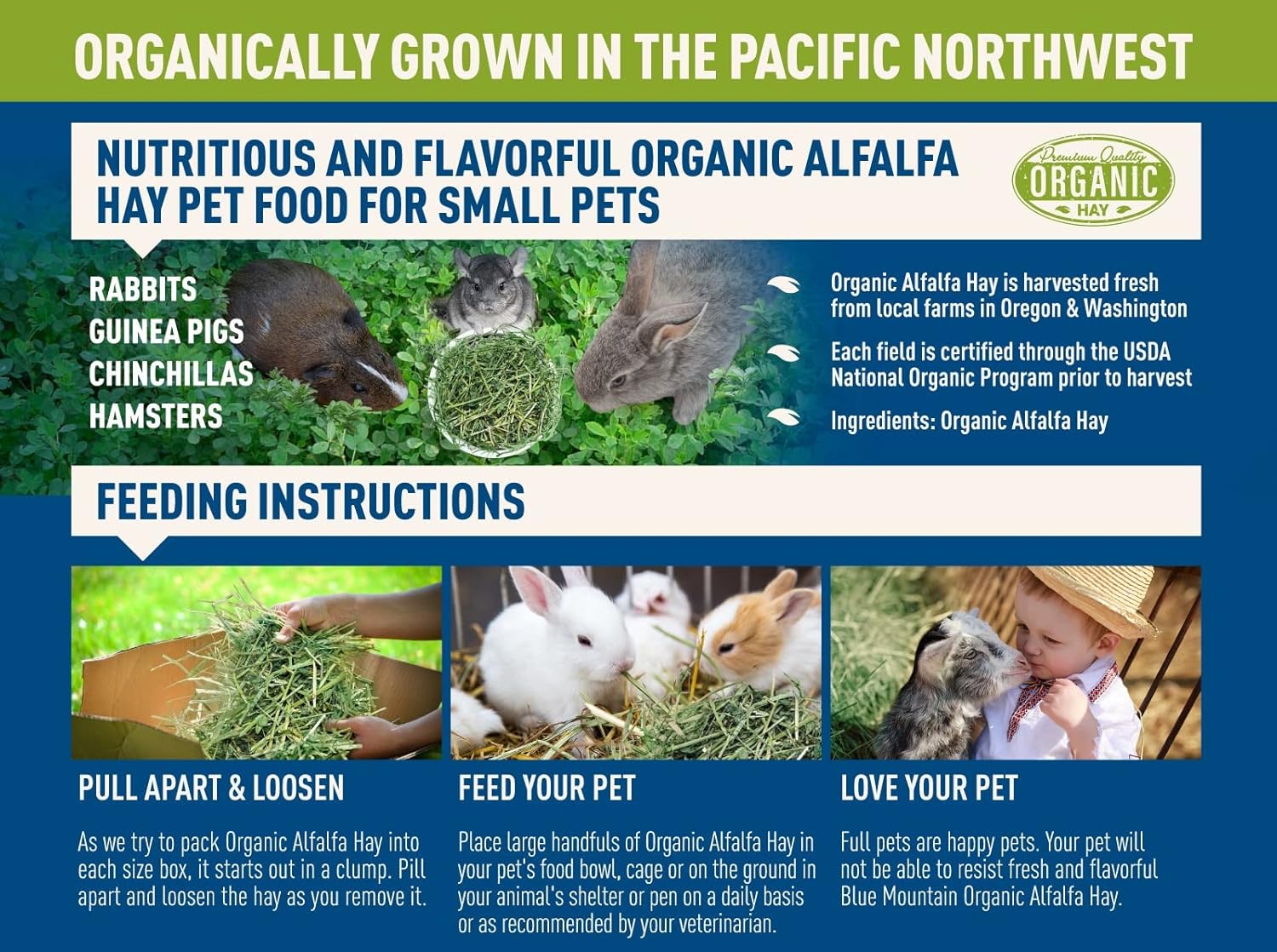 - ORGANIC HIGH-ALTITUDE HAY: Sourced from high-altitude regions in the Pacific Northwest, ensuring the highest quality and nutrient-rich hay for your pet. Our homestead alfalfa hay is grown 100% organically and certified by trusted standards.