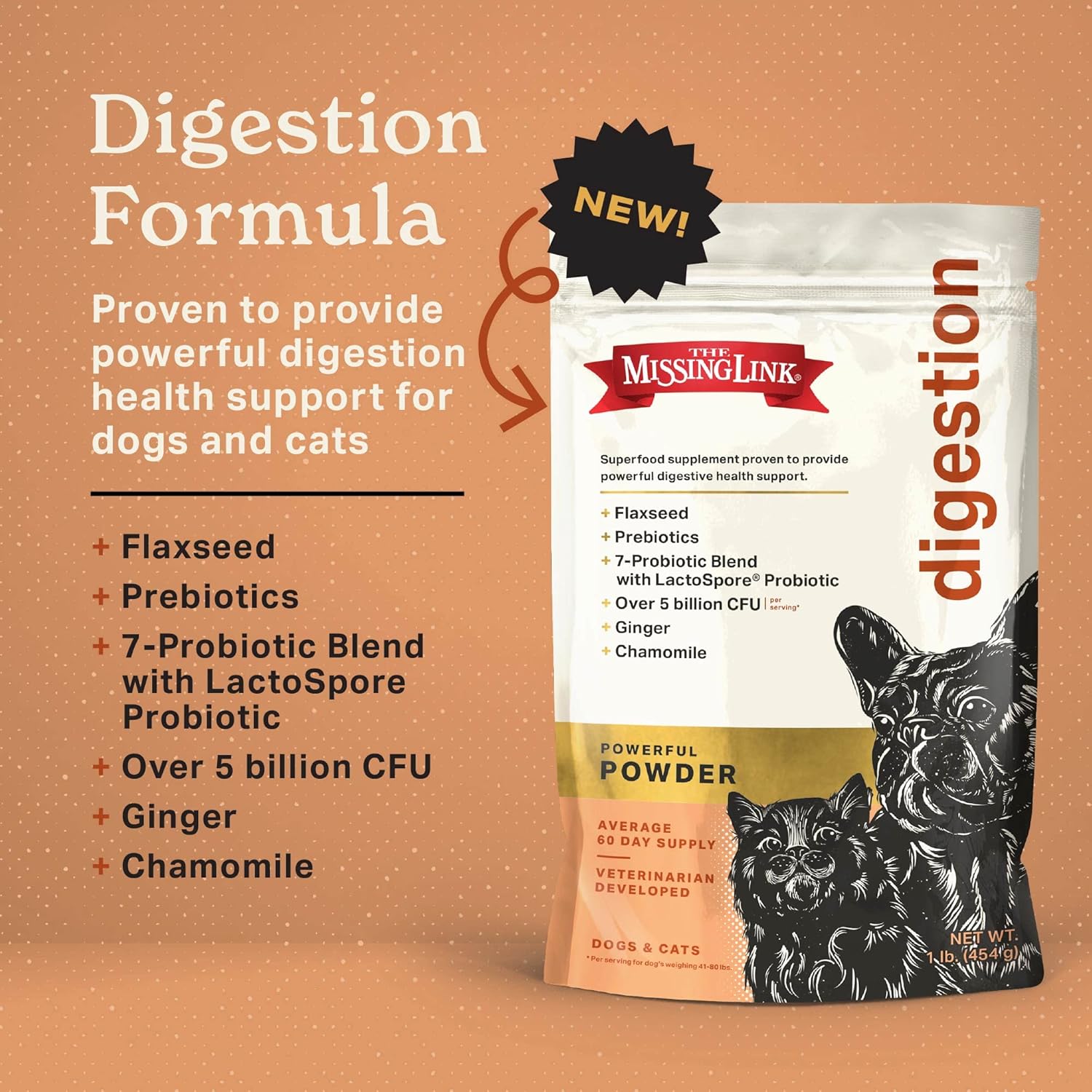 The Missing Link Digestion Superfood Supplement Powder for Dogs & Cats - Fiber, 7-Probiotic Blend + Chicory Root Prebiotic, Ginger, Chamomile - Supports Daily Digestive & Bowel Health - 1lb
