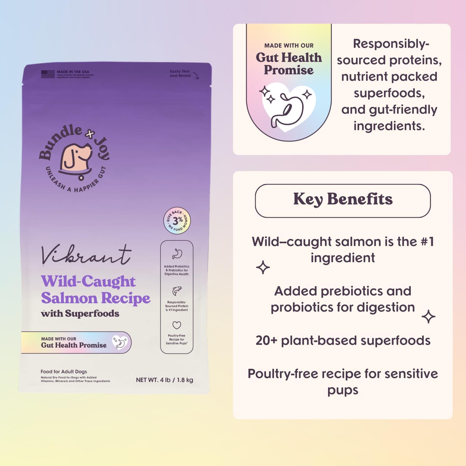 Vibrant Salmon Probiotic Dog Food Dry, 4lb Bag, Allergy and Gut-Friendly Adult Kibble for Digestive Health with Wild-Caught Salmon, 20 Plant Based Superfoods, Beef and Poultry Free