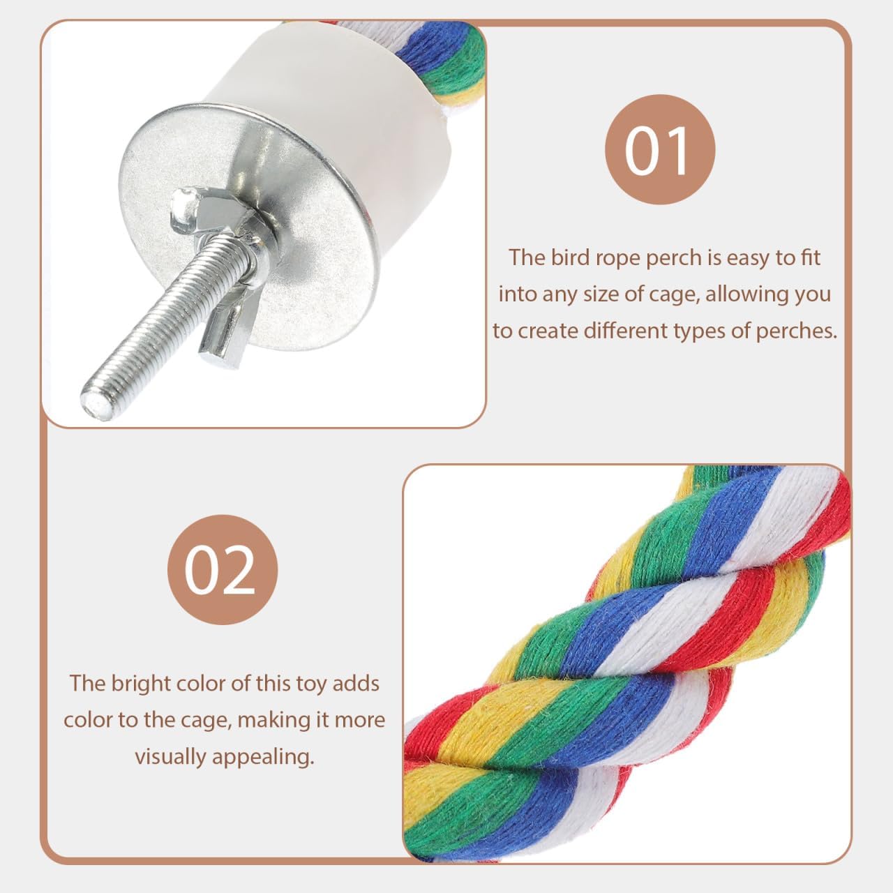 - COLORFUL BIRD ROPE PERCH: Parrot rope perch is made of cotton rope and stainless steel, which is sturdy and durable for long- term use
