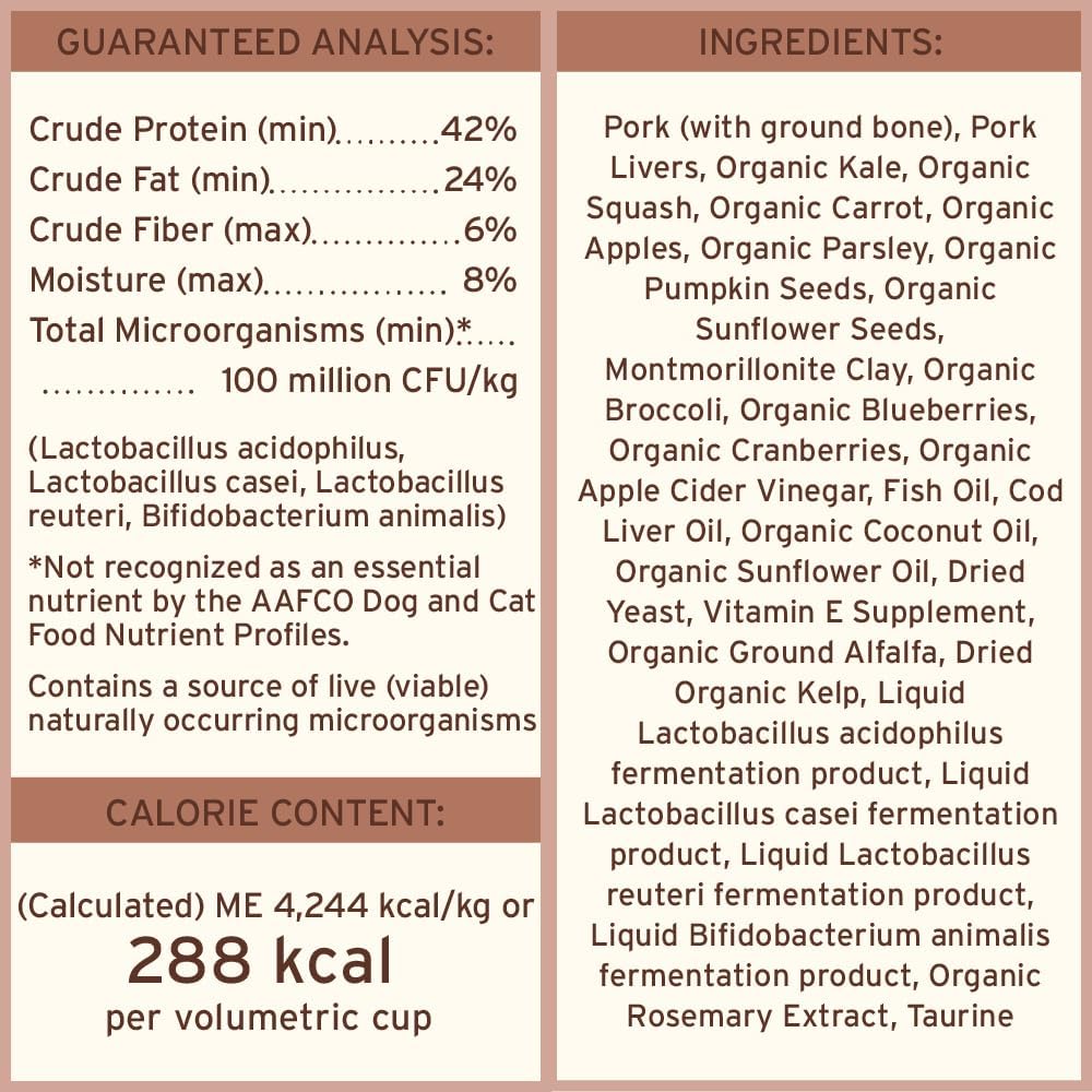 - Premium freeze dried raw dog food made with crate-free pork, raised without antibiotics, steroids or added hormones and with USDA certified organic fruits and vegetables. Grain free