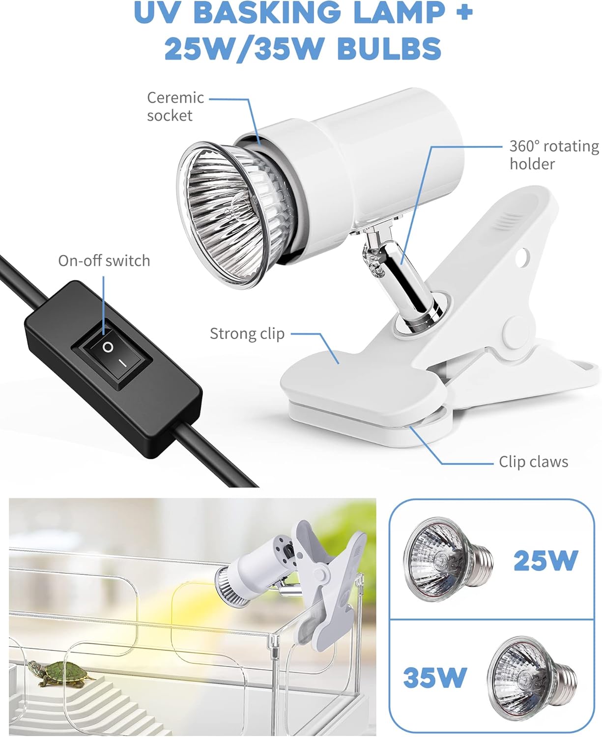 - γUVA/UVB Basking Lamp + 25W/35W BulbsγTurtles need to bask in the sunshine everyday 1-2 hours for metabolism, mood regulation, breeding, etc. 25W/35W Bulbs provide best warmth within distance of 10ββ to 15ββ. Theyβre perfect for this small tank, not too hot not too cold.