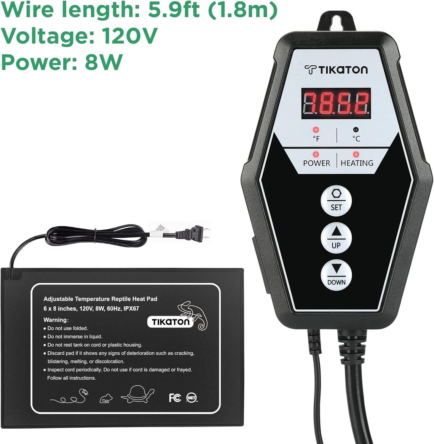 • INTELLIGENT CONSTANT TEMPERATURE: Tikaton reptile heat pad is 120VAC/60Hz,UL-approved; It can get well about 104℉(40℃); Use Tikaton Digital Thermostat to monitor the temperature of your terrarium; Regulates and maintains your preferred temperature within a control range of 40–108 ºF( Temperature display range is 32 -210°F)