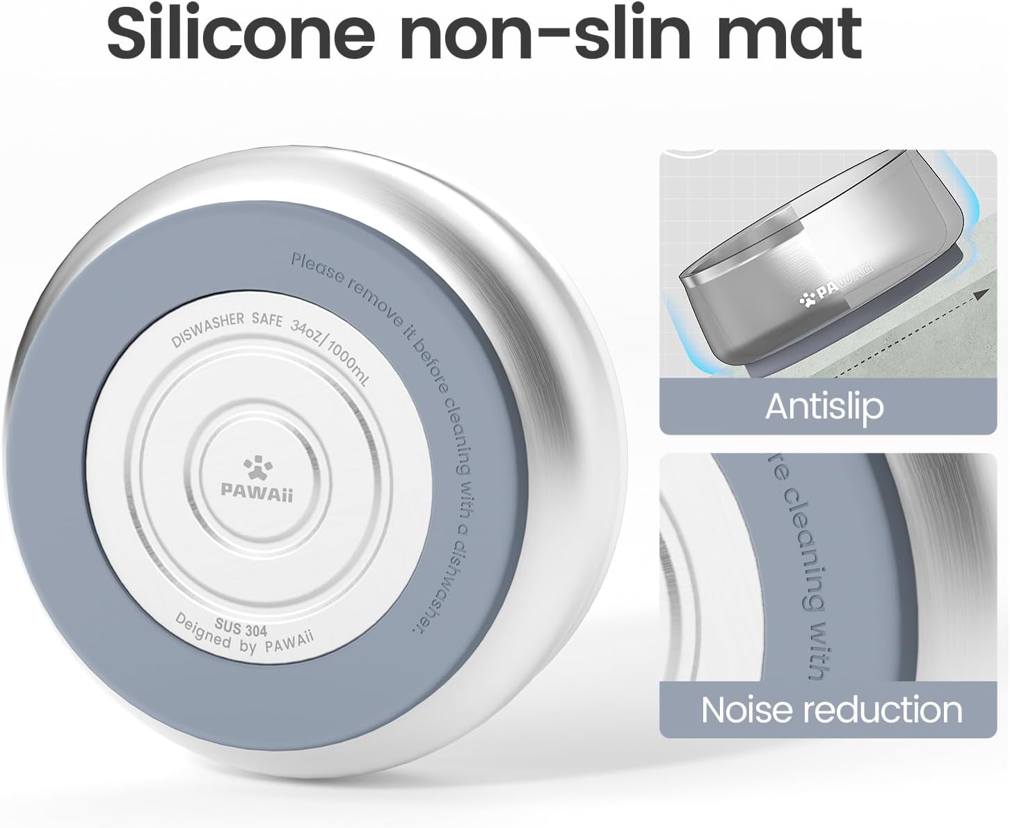 Pawaii Stainless Steel Dog Bowl with Non-Slip Rubber Base & Double Wall Insulation - Durable Design | Includes ID Tag | Dishwasher Safe Food & Water Bowl for All Dogs (34oz)
