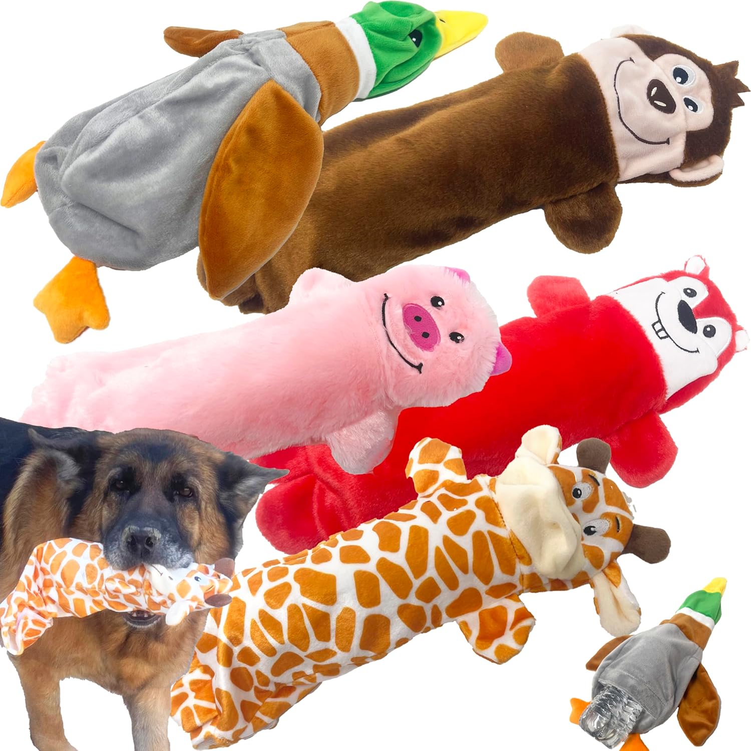 - SUPER VALUE &GREAT FUN: Includes 5 Stuffingless Animal Dog Toy. Each has an openning to place a plastic bottle inside for dogs who love chewing bottles or just some added fun.