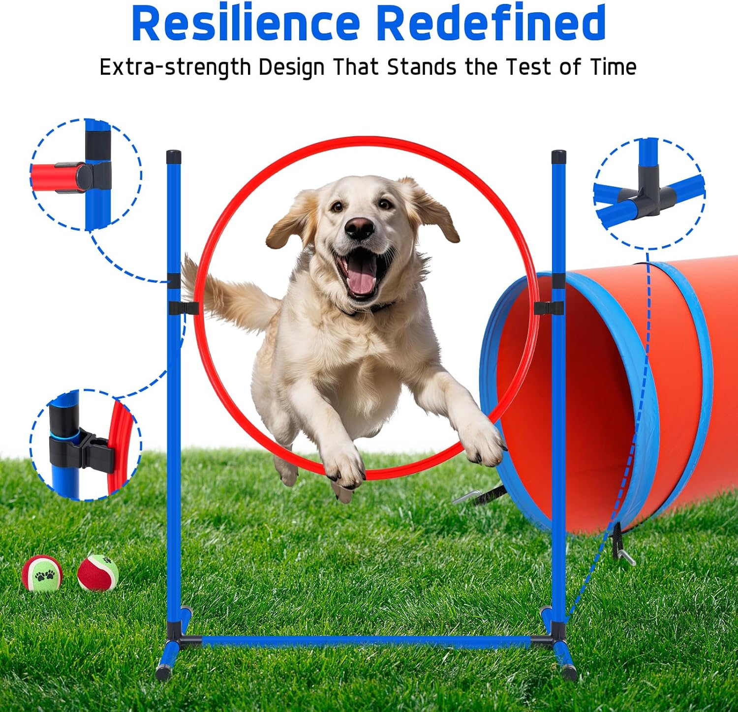 Dog Agility Equipment, Dog Agility Course Backyard Set Obstacle Course Backyard Includes Adjustable High Hurdle,6 Weave Poles,Extended Tunnel,Jump Ring,Square Pause Box,2 Balls,Whistle,2 Carrying Bags