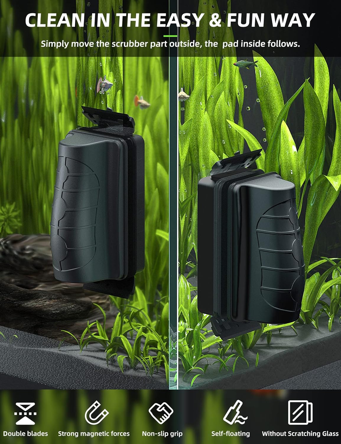 - Easy and fun way to clean the inside of the aquariums from the outside