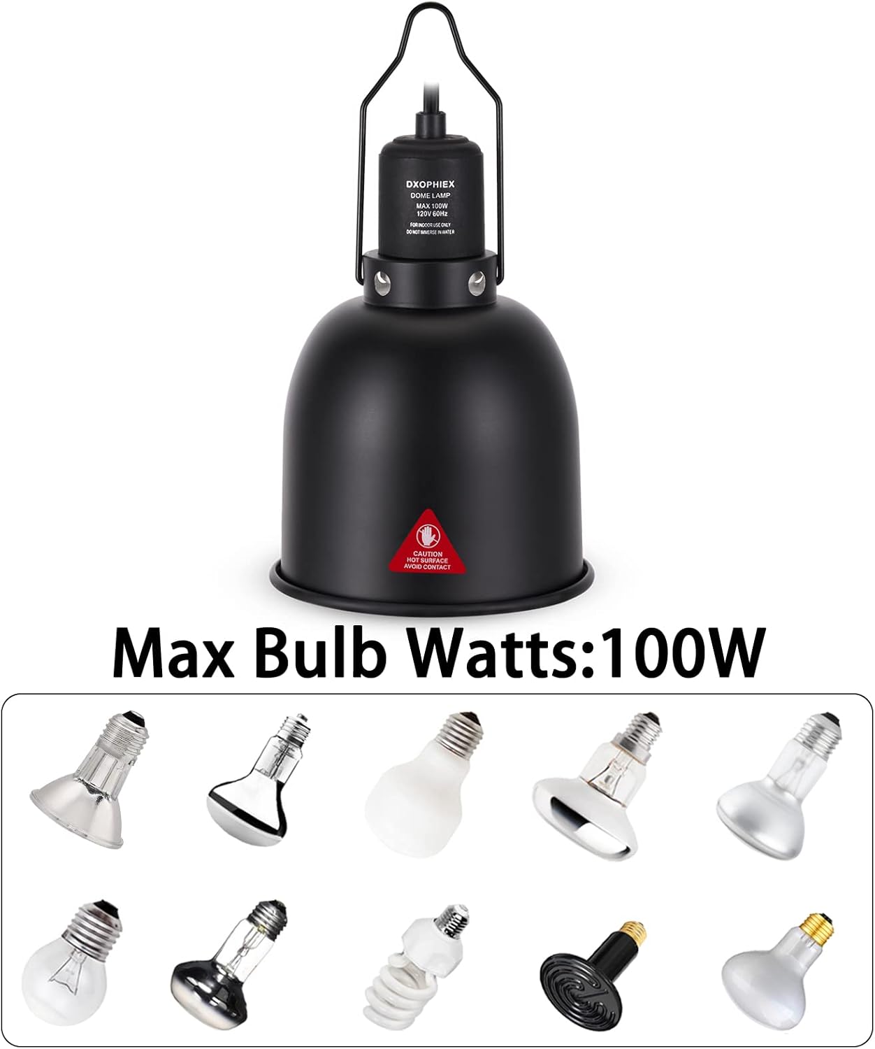 - 【5.5 inch Deep Dome, Max 100W】: This 5.5 inch reptile heat lamp fixture is suitable for bulbs with a maximum power up to 100W, it can be equipped with reptile ceramic heat lamp, UVB UVA basking spot lamp, UVB reptile light, daylight lamp, nightlight lamp, infrared spot lamp and so on.