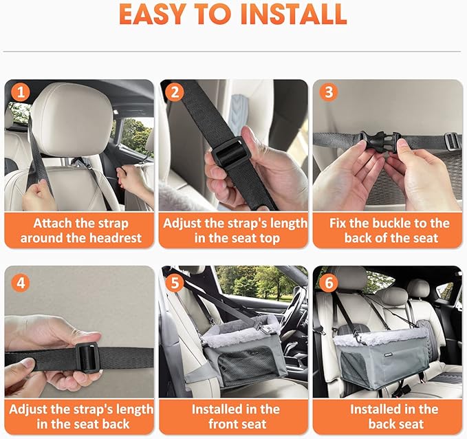 - πΆ[Easy to Install]: With its adjustable buckle design, the car seat for dogs can be easily installed. Simply attach the two straps around the headrest, fix the buckle to the back of the seat, and adjust the strap length as needed. It can be installed in both the front and back seats of your car, and it is compatible with most types of car seats and car models.