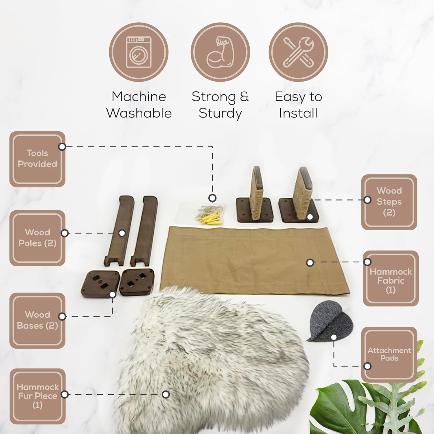 Multi-Level Cat Wall Hammock with Plush Cushion and Two Steps - Shelves Set with Perches for Playing, Climbing, and Sleeping - Wooden Cat Wall Bed