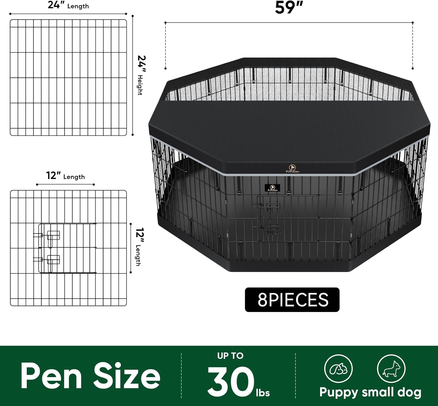 PJYuCien Dog Playpen, 8 Panels 24’’H Dog Pens Indoor with Bottom Pad and Top Cover, Metal Foldable Pet Puppy Exercise Fence Crate Kennel, Better for Small Animals,Black