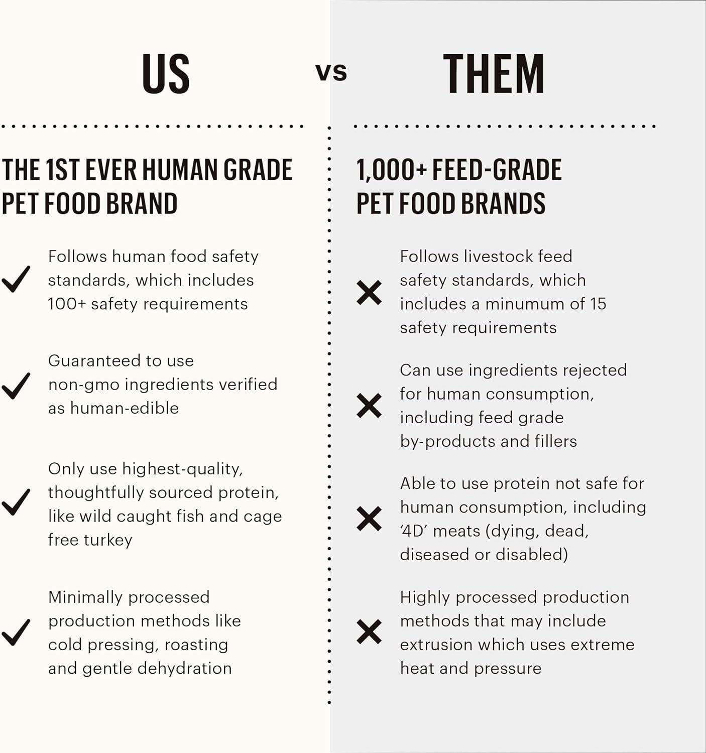 - NO COMPROMISE ON QUALITY: We prioritize your pet's health by saying no to feed grade ingredients, meat meals, and artificial preservatives. Our human grade dog food is crafted to provide only the best nutrition without compromise